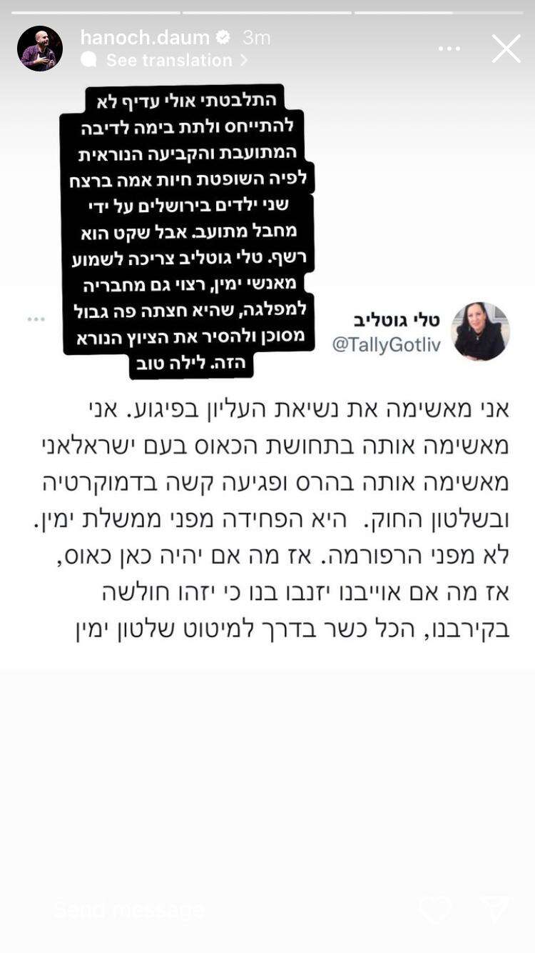 חנוך דאום העלה היום (ראשון), בשעת לילה מאוחרת למדי, התייחסות לציוץ של חברת הכנסת טלי גוטליב, שבו האשימה את נשיאת בית המשפט העליון אסתר חיות בפיגוע הדריסה הרצחני בירושלים, והוא לא היה היחיד.