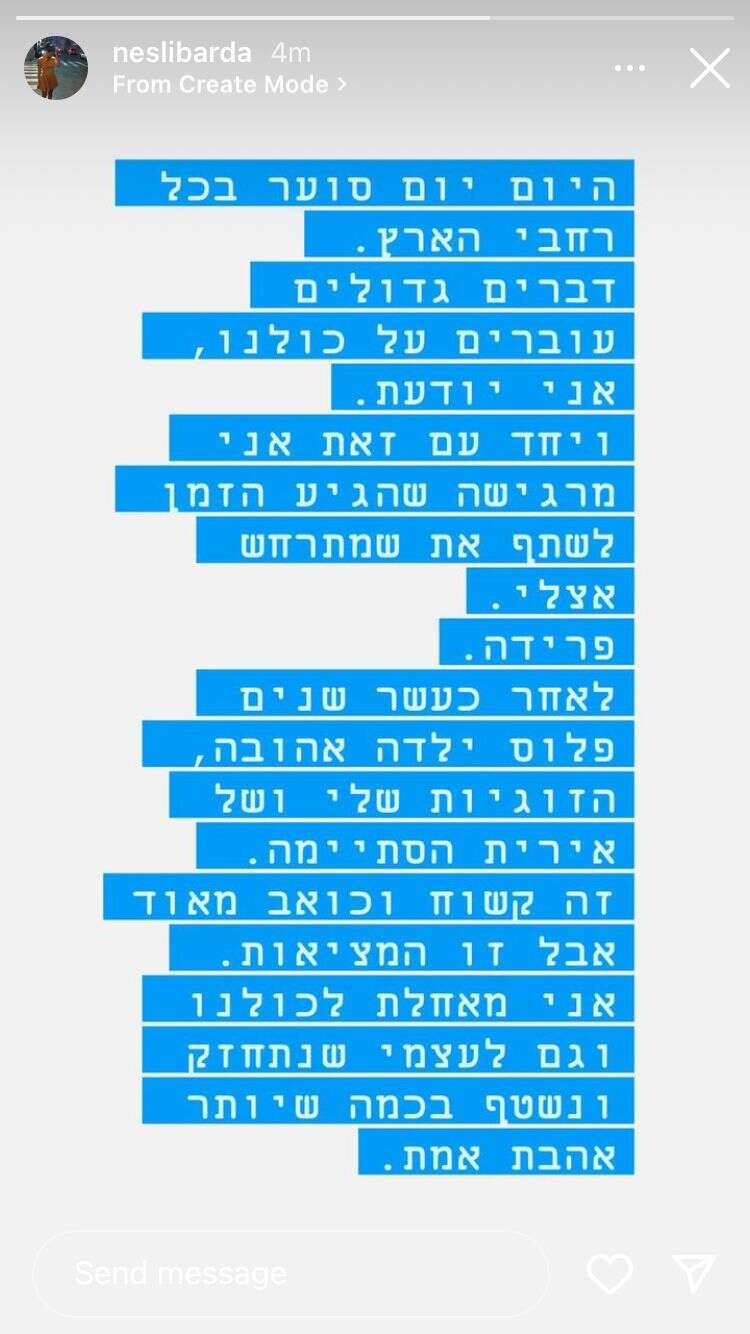 "היום יום סוער בכל רחבי הארץ", כתבה ברדה על רקע יום השיבוש. "דברים גדולים עוברים על כולנו, אני יודעת, ויחד עם זאת אני מרגישה שהגיע הזמן לשתף את שמתרחש אצלי. פרידה. לאחר כעשר שנים פלוס ילדה אהובה, הזוגיות שלי ושל אירית הסתיימה", הודיעה.