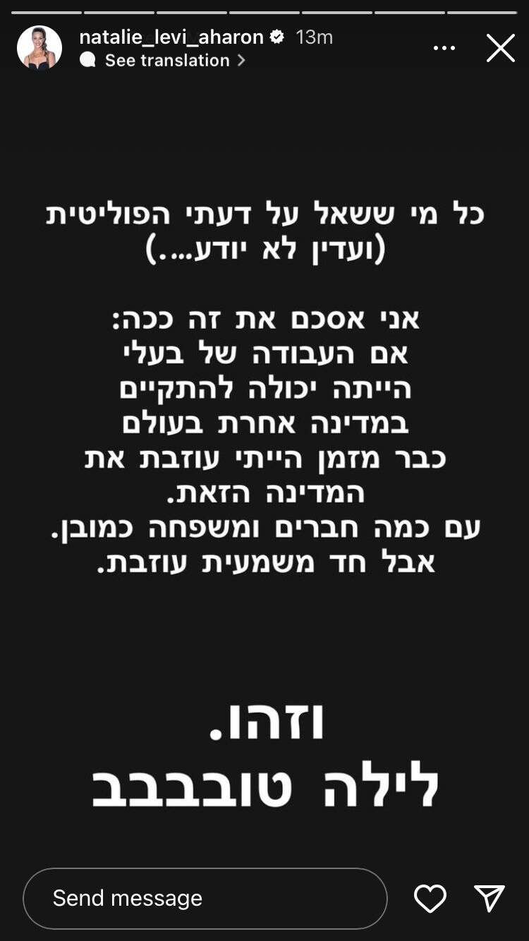 מי שעוקב אחרי תכניה באינסטגרם של נטלי לוי-אהרון, אשתו ואם שתי בנותיו של הזמר דודו אהרון, לא יכול לטעות לגבי דעותיה הימניות הנחרצות שהיא מקפידה להביע שם. אמש (שלישי) בשעת לילה מאוחרת, ככל הנראה בעקבות האירועים הדרמטיים האחרונים שהתרחשו במדינה בצל חקיקת ביטול עילת הסבירות, לוי-אהרון החליטה לשתף בתחושותיה, וסיפרה לעוקביה על רצונה העז לעזוב את המדינה.