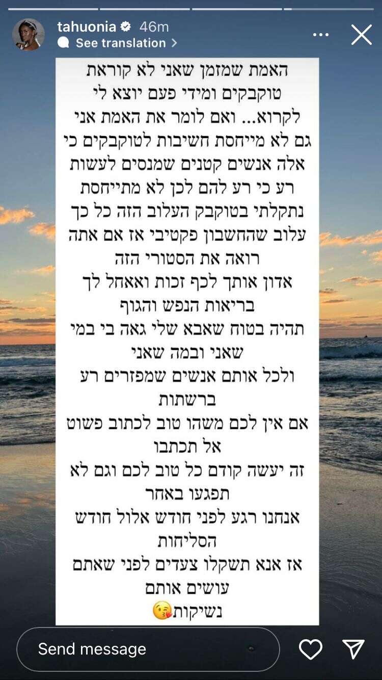 "תגידי, גברת טהוניה, אין לך טיפה של בושה?", נשאלה רובל בזעם. "עוד לא שלושים לאבא שלך, ואת מעלה סרטון שלך עם בגד ים חושפני? מזעזע. לפני יומיים דיברת על ההתקרבות שלך לדת. אבא שלך כבר יטפל בך כמו שצריך מהשמיים. עזבי את כל הצער והבושה שהוא סבל ממך כל השנים. את לא לומדת לקח, ואין לך טיפה של כיבוד הורים, שלא נדבר על הכבוד העצמי. הכי גרוע שלך שאת עושה את ההצגות שלך לכל מיני גורמים. הלוואי שהיית יכולה לראות מה עשיתי עם הרוק, האצבע וכף היד. עכשיו, כרגיל, תמחקי את התגובה שלי. ולא יפה לך צהוב, והילדה יפה כמו אבא שלה".