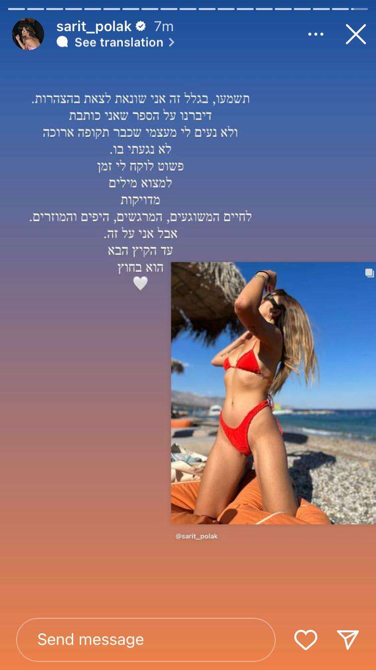 בסטורי המדובר הוסיפה פולק לינק לפוסט חדש שהעלתה באותם רגעים שגם בו המשיכה לעדכן לגבי תוכניותיה. "חודשיים על קו תל אביב יוון. היה קיץ קיצוני", סיפרה מתחת לחמש תמונות שהעלתה. "ויש לי ספר שלם להמשיך לכתוב. רק חייבת למצוא את המילים הנכונות. מבטיחה שעד הקיץ הבא הוא יוצא לאור".