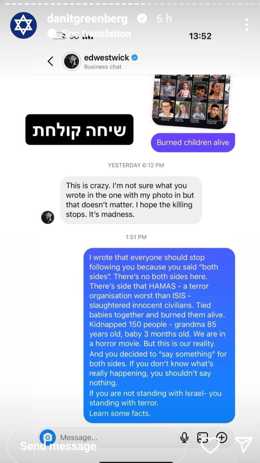 דנית גרינברג מעולם לא הסתירה את הערצתה לכוכב "אחת שיודעת" השחקן הבריטי אד ווסטוויק, אך אתמול (ראשון) החליטה להסיר ממנו עוקב לאחר שזה שיתף פוסט בו הביע תמיכה גם בפלשתינים ואף הגדילה לעשות ועדכנה אותו בכך. "הם שרפו ילדים חיים", שיתפה גרינברג את ווסטוויק בצילום מסך ששלחה לו בהתכתבות פרטית בין השניים בפייסבוק עם תמונות הילדים שנחטפו בקיבוץ.