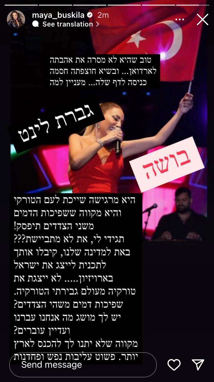 בסטורי שהקדישה במיוחד עבור הנושא, תקפה אמש (שני) מאיה בוסקילה את הזמרת לינט מנשה שזוכה כבר שנים ארוכות להצלחה מרשימה בטורקיה. הסיבה? פוסט שכתבה לינט בעמודה הפופולרי באינסטגרם בעל למעלה ממיליון העוקבים שבו שלחה מסרים שקוראים להרגעת הרוחות משני צדי המתרס והביעה "משאלה שהאכזריות ושפיכות הדמים יסתיימו בהקדם האפשרי עבור שני הצדדים".