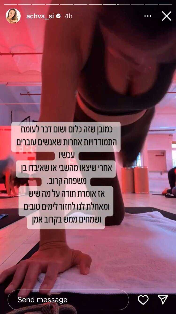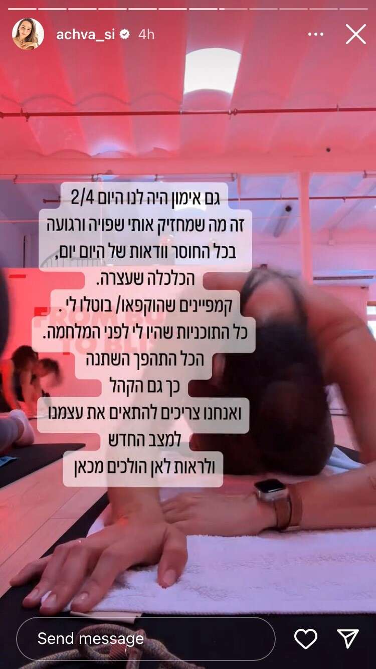 "הספורט זה מה שמחזיק אותי שפויה ורגועה בכל חוסר הוודאות של היום-יום, בכלכלה שעצרה", כתבה בסטורי שפרסמה על רקע תמונה שלה מחדר הכושר. "יש קמפיינים שהוקפאו או בוטלו לי. כל התוכניות שהיו לי לפני המלחמה, הכל התהפך, השתנה וכך גם הקהל. אנחנו צריכים להתאים את עצמנו למצב החדש ולראות לאן הולכים מכאן. כמובן שזה כלום ושום דבר לעומת התמודדויות אחרות שאנשים עוברים עכשיו אחרי שיצאו מהשבי או שאיבדו בן משפחה קרוב. אני תודה על מה שיש, ומאחלת לנו לחזור לימים טובים ושמחים ממש בקרוב, אמן".