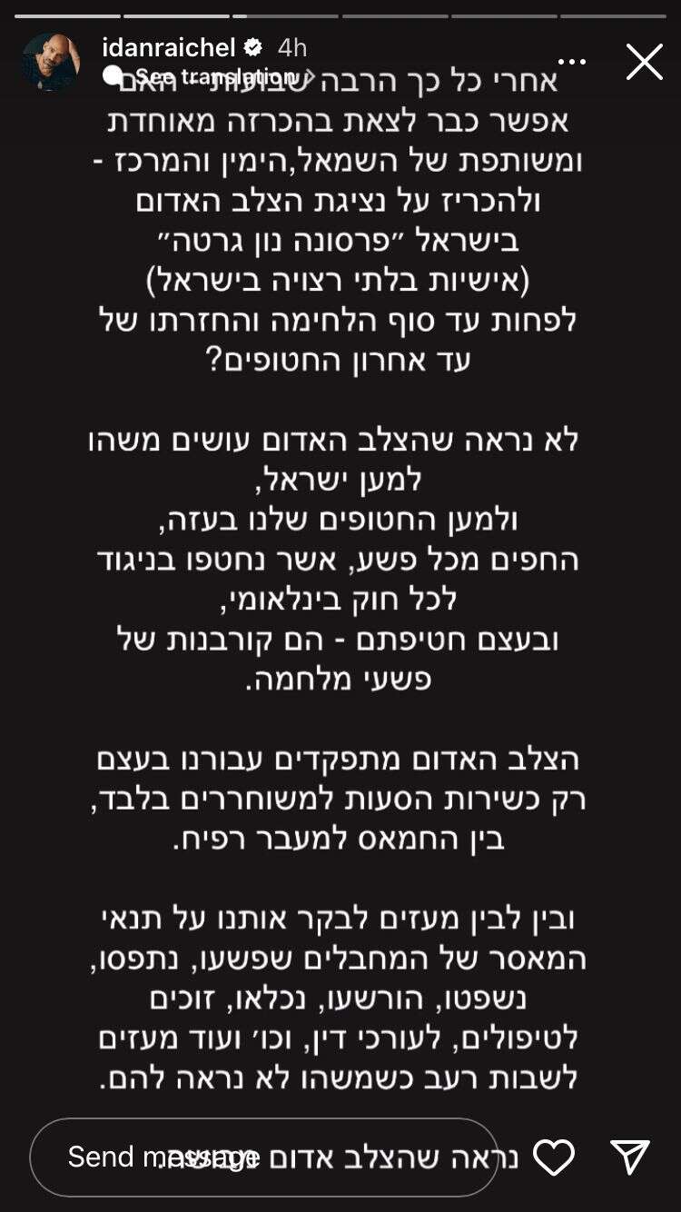 כשהוא מניח שכל אזרחי ישראל מכל צידי המפה הפוליטית מחזיקים בדעה דומה לשלו, עידן רייכל תקף אמש (שני) את ארגון "הצלב האדום" כשקרא לסלק את נציגתו מישראל. בטקסט נוקב וביקורתי שהעלה לחשבונו ברשת החברתית אינסטגרם הוא הגדיר את הארגון כ "שירות הסעות" מוטה ולא הוגן וטען כי אין בעצם נוכחותו בישראל שום ערך.