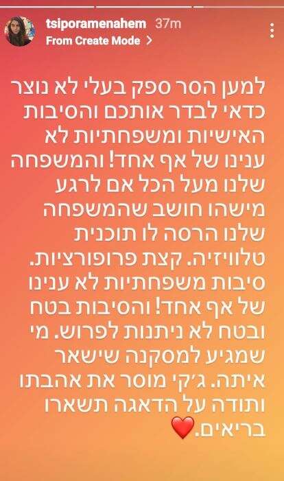 אף שהיו גם קולות אחרים שביקשו להרגיע את הזעם ולעזוב את ציפורה לנפשה, המסרים התוקפניים הצליחו לערער את שלוותה, והיום בחרה להתייחס לדברים בפוסט קצר אך זועם שהעלתה לסטורי שלה.