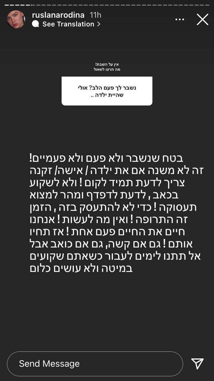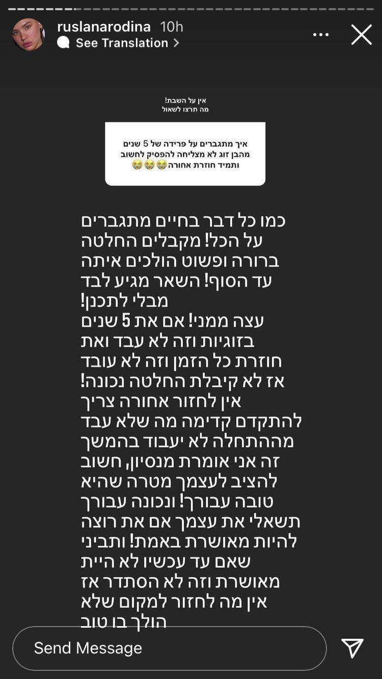 רוסלנה רודינה החליטה גם היא לפתוח את הלב, והשיבה על שאלות גולשים. בין כל התשובות, רודינה נתנה גם עצות על זוגיות ופרידות שגרמו לנו לחשוד מייד שהן בעצם רמזים למערכת היחסים לשעבר עם האקס המפורסם מרחובות.