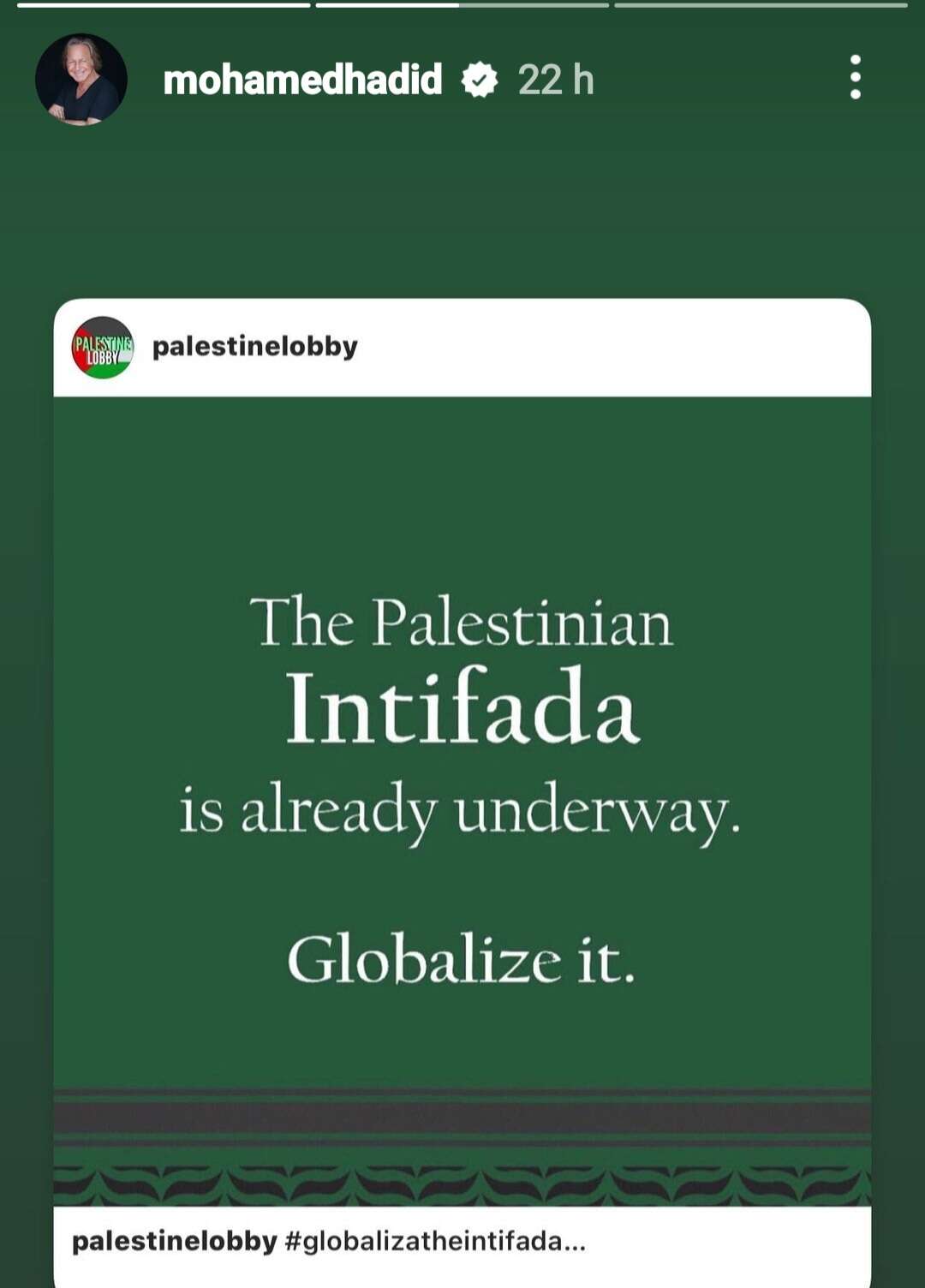 אמש (שלישי) העלה חדיד לאינסטגרם שלו שורת סטוריז נוספים שיצאו נגד ישראל, כשבאחד מהם שיתף פוסט מתוך עמוד האינסטגרם Palestinelobby המונה 59.8 אלף עוקבים בו נכתב: "האינתיפאדה הפלשתינית כבר מתרחשת בשטח. הפכו אותה לגלובאית". הפוסט המקורי אמנם צבר רק כמה מאות בודדים של לייקים, אך הקול הישראלי והיהודי נשמע היטב בשורת תגובות שליוו את הפוסט, ביניהן: "בושה, ככה השואה התחילה", "עם ישראל חי", "זה מצחיק איך הם טוענים להרג של אזרחים תמימים והם קוראים לאינתיפאדה" ו"איזה פוסט מטופש. זה פחות או יותר קורא להפגיז יהודים בכל העולם. מדווח על הפוסט הזה", כתב גולש זועם.