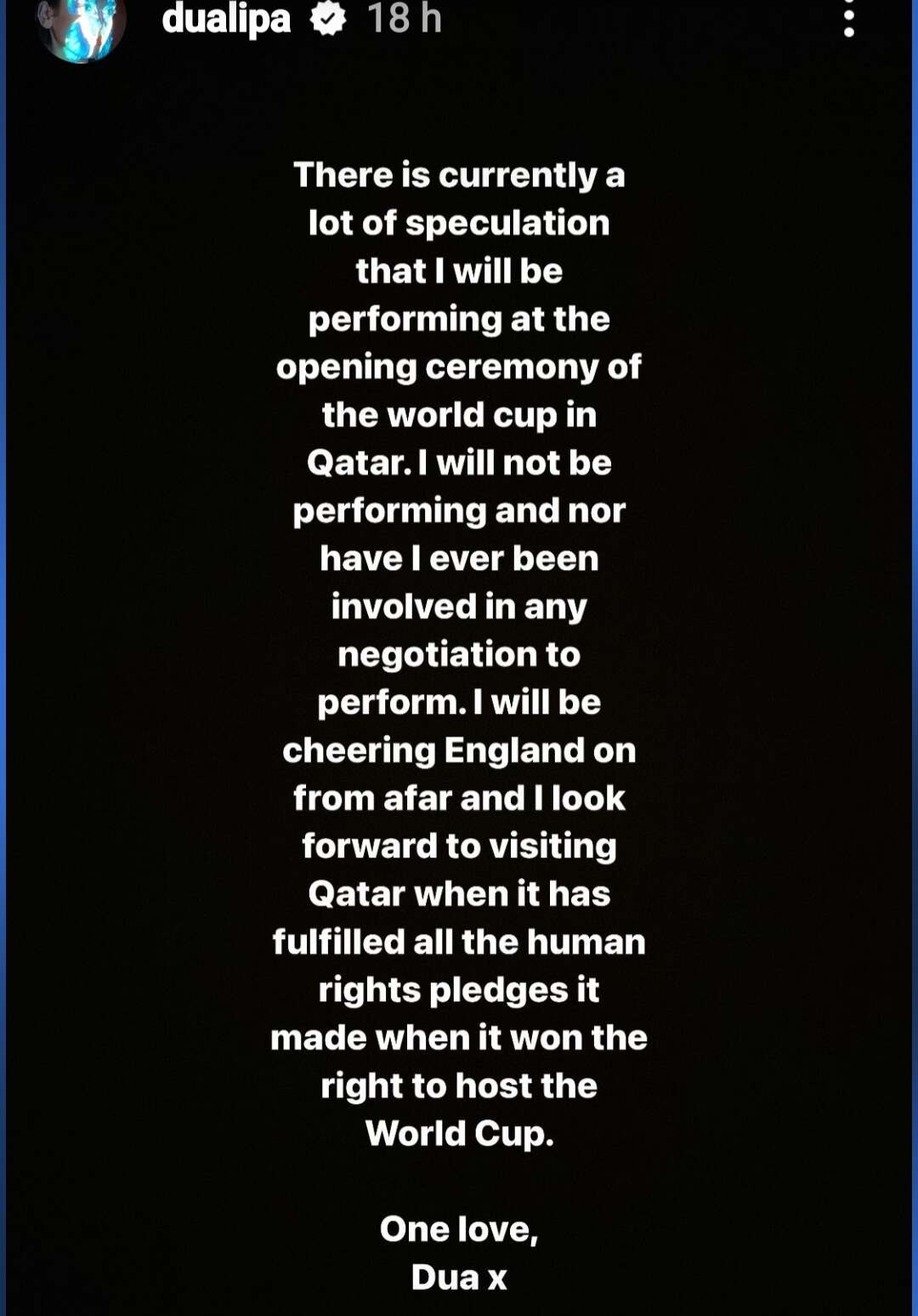 "יש המון ספקולציות שאני אופיע בטקס הפתיחה של המונדיאל בקטאר", פתחה ליפה (27) את הסטורי שלה אותו חלקה עם 87.4 מיליון עוקביה באינסטגרם. "אני לא אופיע", הכריזה נחרצות וכדי שלא תהיינה ספקות, הוסיפה והדגישה כי מעולם לא לקחה גם חלק במשא ומתן להופעה שכזו. "אני אעודד את אנגליה מרחוק ואני מחכה ומצפה לבקר בקטאר כשזו תמלא את כל חובותיה לזכויות האדם עליהן התחייבה כשזכתה בזכות לארח את המשחקים. אהבה אחת", סיכמה.