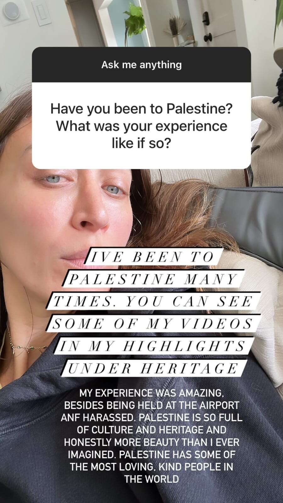 בסשן שאלות ותשובות שקיימה חדיד בנוהל בסוף השבוע האחרון עם 398 אלף עוקביה, נשאלה על ידי גולשת האם ביקרה בפלשתין ומה הייתה החוויה שלה מהביקור. באותיות ענקיות חדיד השיבה שביקרה בפלשתין (הלוא היא מדינת ישראל) פעמים רבות, ואף הזכירה למאות אלפי עוקביה כי הביקורים שלה מתועדים בהיילייטס בעמוד שלה תחת הכותרת "מורשת". ואכן ניתן למצוא עשרות סרטונים מביקוריה בארץ, שאותה היא מכנה "ארץ אבותיה".