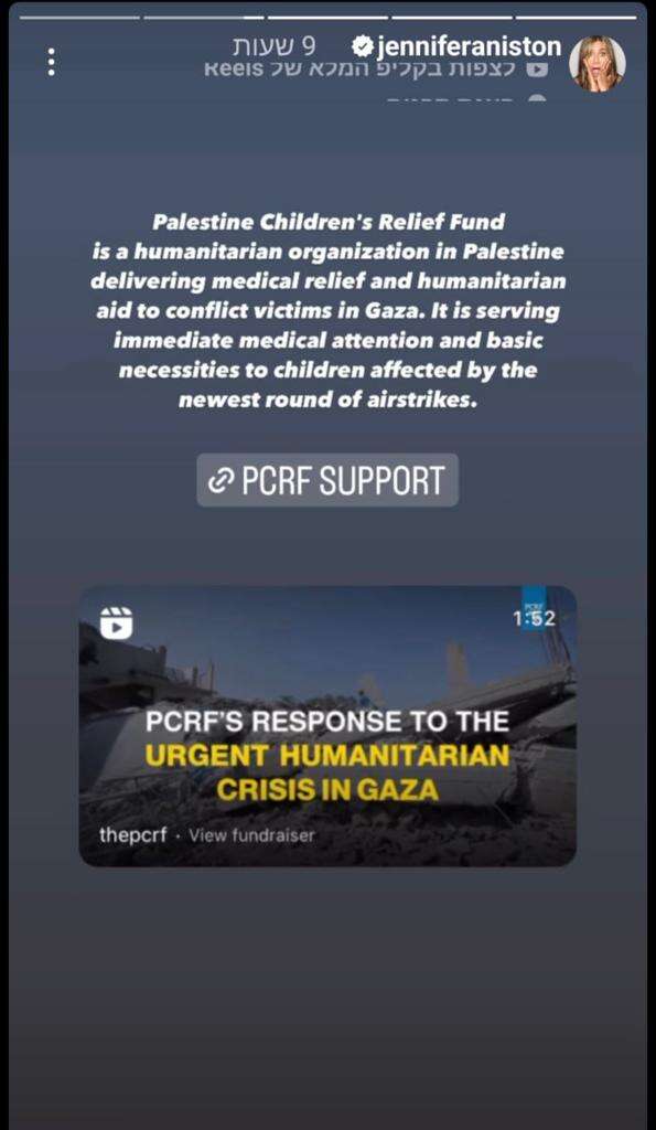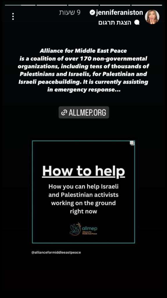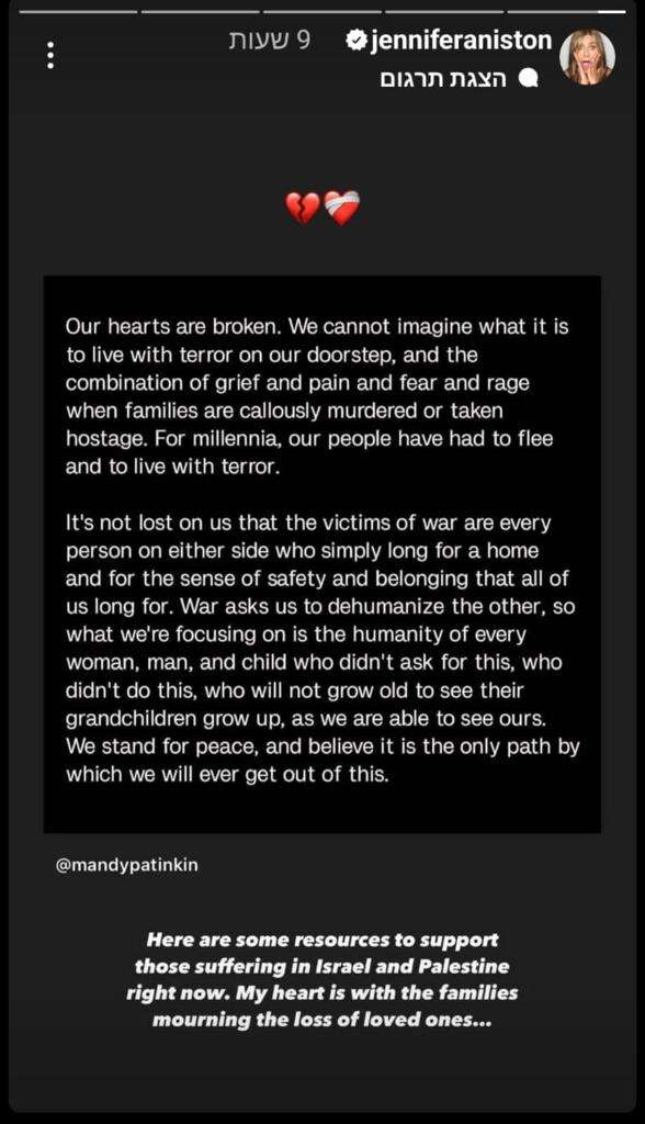"הנה כמה משאבים לתמוך באלה שסובלים עכשיו בישראל ובפלשתין. הלב שלי יוצא למשפחות שמאתבלות על אובדן יקיריהן", כתבה אניסטון בתחילת סדרת הסטוריז שלה.