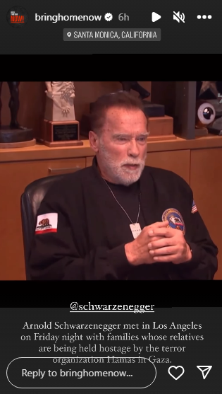 "אני חבר טוב של העם היהודי ושל ישראל", אמר שוורצנגר במפגש שאורגן על ידי מרווין האייר, מייסד מוזיאון הסובלנות שבלוס אנג'לס, יחד עם מטה החטופים בארץ ואיש העסקים סילבן אדמס, בנוכחות קונוסול ישראל בעיר, ישראל בכר.