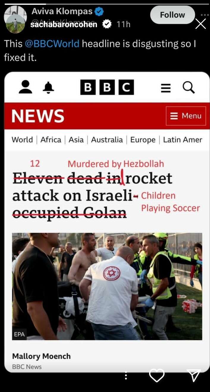 הכוכב הבריטי-יהודי שיתף בחשבון האינסטגרם שלו, שבו יש לו 1.2 מיליון עוקבים, סטורי שבו ניתן לראות כותרת "מתוקנת" לכתבה שפורסמה באתר ה-BBC, השייך לתאגיד השידור הציבורי בבריטניה.