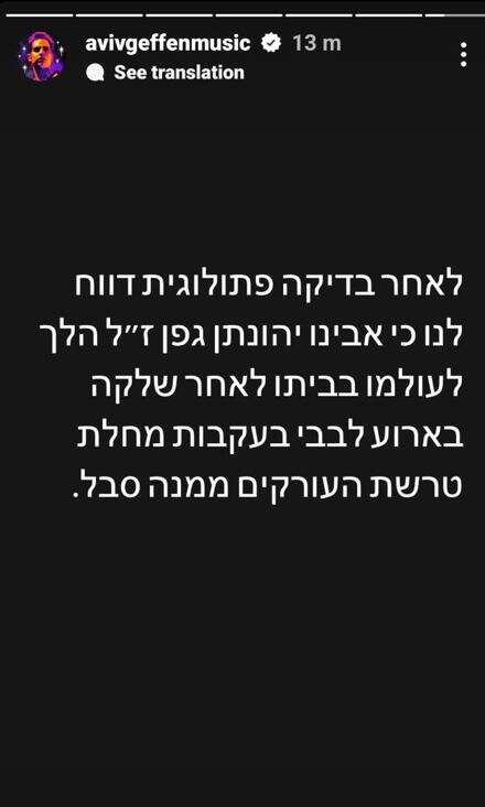 "לאחר בדיקה פתולוגית דווח לנו כי אבינו יהונתן גפן ז״ל הלך לעולמו בביתו לאחר שלקה באירוע לבבי בעקבות מחלת טרשת העורקים ממנה סבל", עדכן גפן הבן את עוקביו.