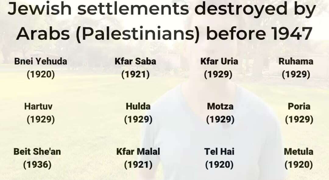 "לעומת זאת, אני יכול לתת לכם שמות רבים של יישובים יהודיים שערבים או פלשתינים הרסו לפני 1948 - חברון למשל, יהודים גרו בחברון מאות שנים, וב-1929 קבוצת ערבים רצחה 70 יהודים, וההתיישבות היהודית העתיקה נאלצה להינטש עד שחזרה לידיים יהודיות ב-1967". שמות נוספים של מקומות שאורן הביא בסרטון הם כפר אוריה, בני יהודה, כפר מלל ועוד.