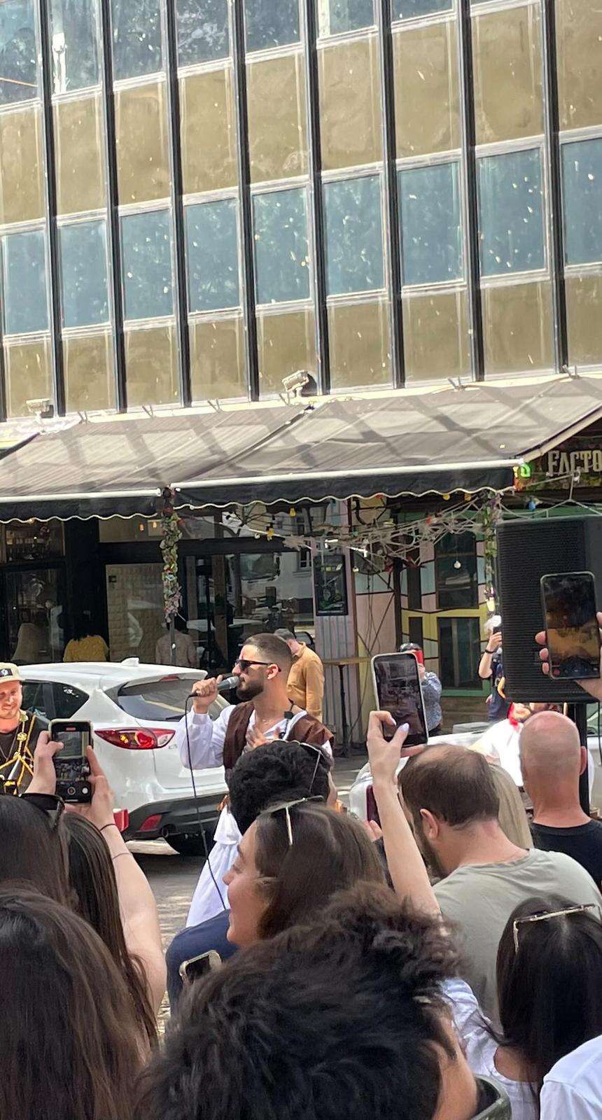 קהל אוהדיו של עדן חסון מתאספים סביבו בזמן הופעה בהפתעה בשדרות רוטשילד. צילום: ללא קרדיט