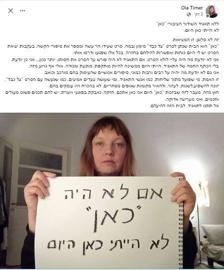 "לולא תאגיד השידור 'כאן' לא הייתי כאן היום", כתבה אולה, שהשמיטה ברשת החברתית את שם משפחתה ונקראת אולה טימר. "זה לא סלוגן, זו המציאות. 'כאן' הוא הבית שנתן לסרט 'צל כבד' מימון ובמה. סרט שהבמאי עידו הר עשה ומספר את סיפורי הקשה. בעקבות יציאת הסרט יש לי היום כוחות ואפשרות להילחם בחזרה, בכל אלו שפגעו ודרסו אותי.