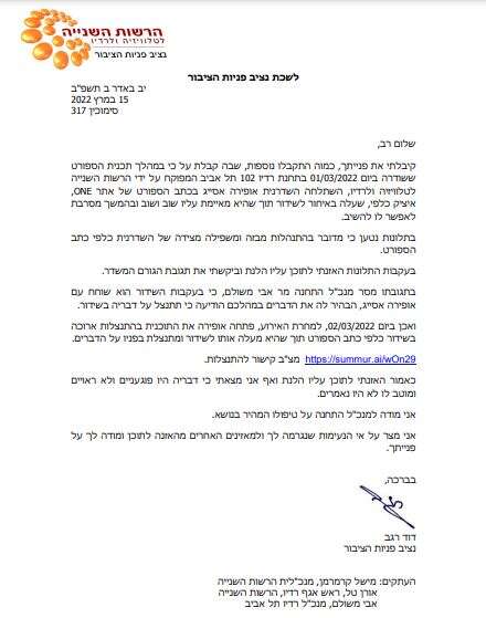 ״מנכ"ל התחנה מר אבי משולם עדכן כי בעקבות השידור הוא שוחח עם אופירה אסייג, הבהיר לה את הדברים, והיא הודיעה כי תתנצל על דבריה בשידור. ואכן למחרת האירוע פתחה אופירה את התוכנית בהתנצלות ארוכה בשידור כלפי כתב הספורט, תוך שהיא מעלה אותו לשידור ומתנצלת בפניו על הדברים", לשון המכתב.