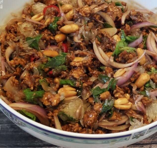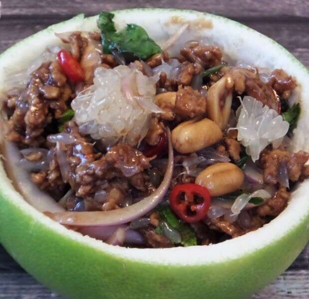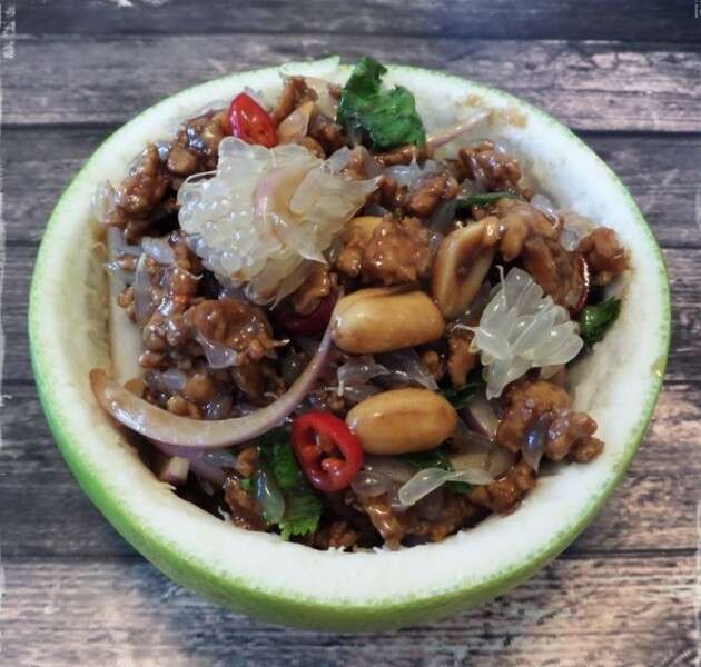 בקערה מערבבים פומלית אחת (או 1/2 פומלה) קלופה ומפולטת, 1 בצל סגול חתוך לרצועות, 1/2 כוס עלי כוסברה שלמים, 1/2 כוס עלי נענע שלמים, 1/2 כוס בוטנים מלוחים ופלפל צ'ילי אחד, נקי מגרעינים וחתוך לטבעות.