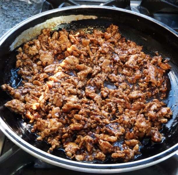 יוצקים שמן קנולה למחבת (בערך 3-2 כפות) ומטגנים 300 ג' עוף טחון, עד שהוא נהיה פירורים פירורים, ומלבין מכל הצדדים.