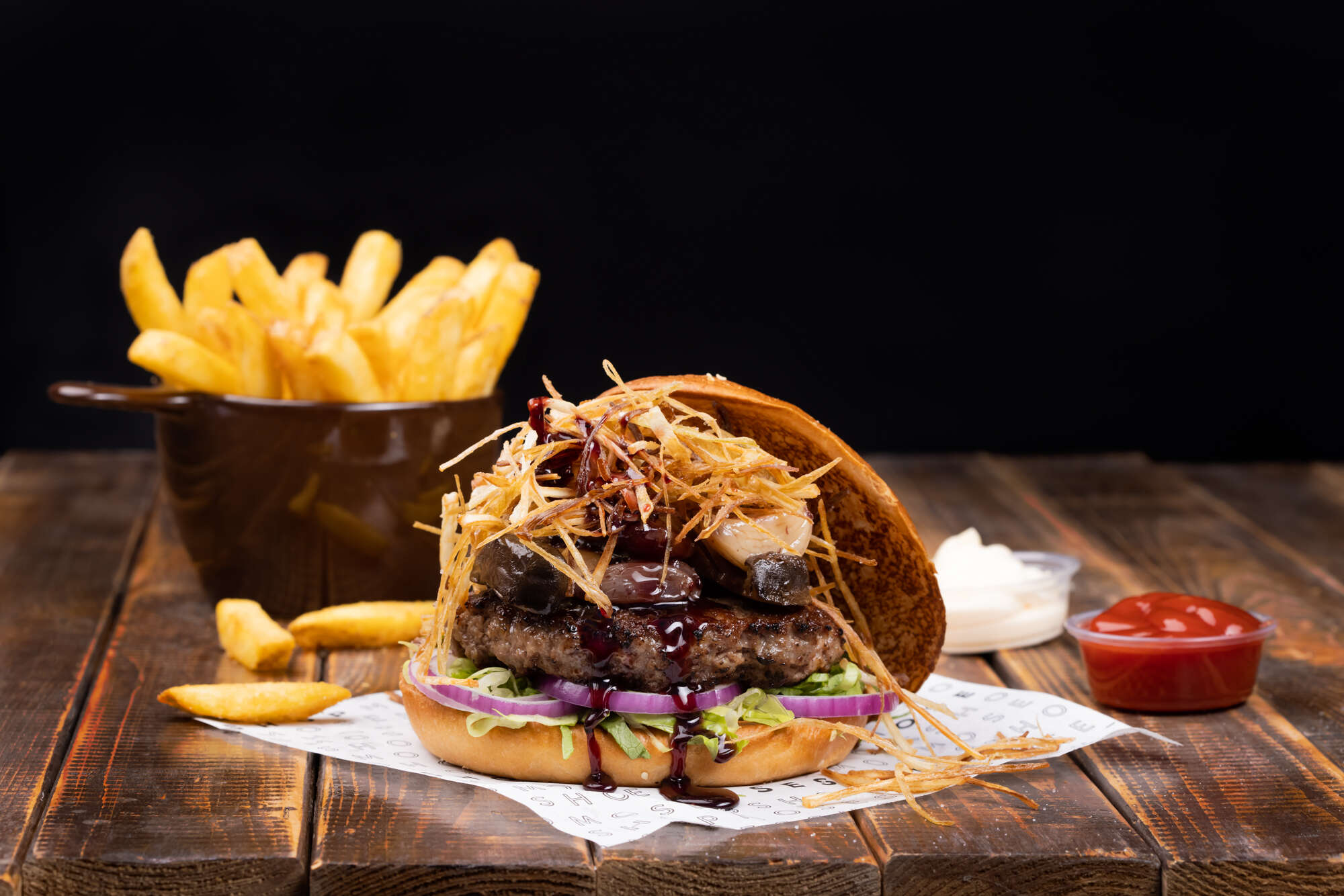 MOON LIGHT, המבורגר קלאסי שכולל חסה שיפונד, בצל סגול, עם שום המבושל בזיגוג מתקתק של יין אדום וסוכר, רצועות כרישה דקות ופריכות ופטריית מלך היער. ארוחה מלאה הכוללת המבורגר, צ'יפס ושתיה - 71 שקלים. המבורגר בודד - 58 שקלים.