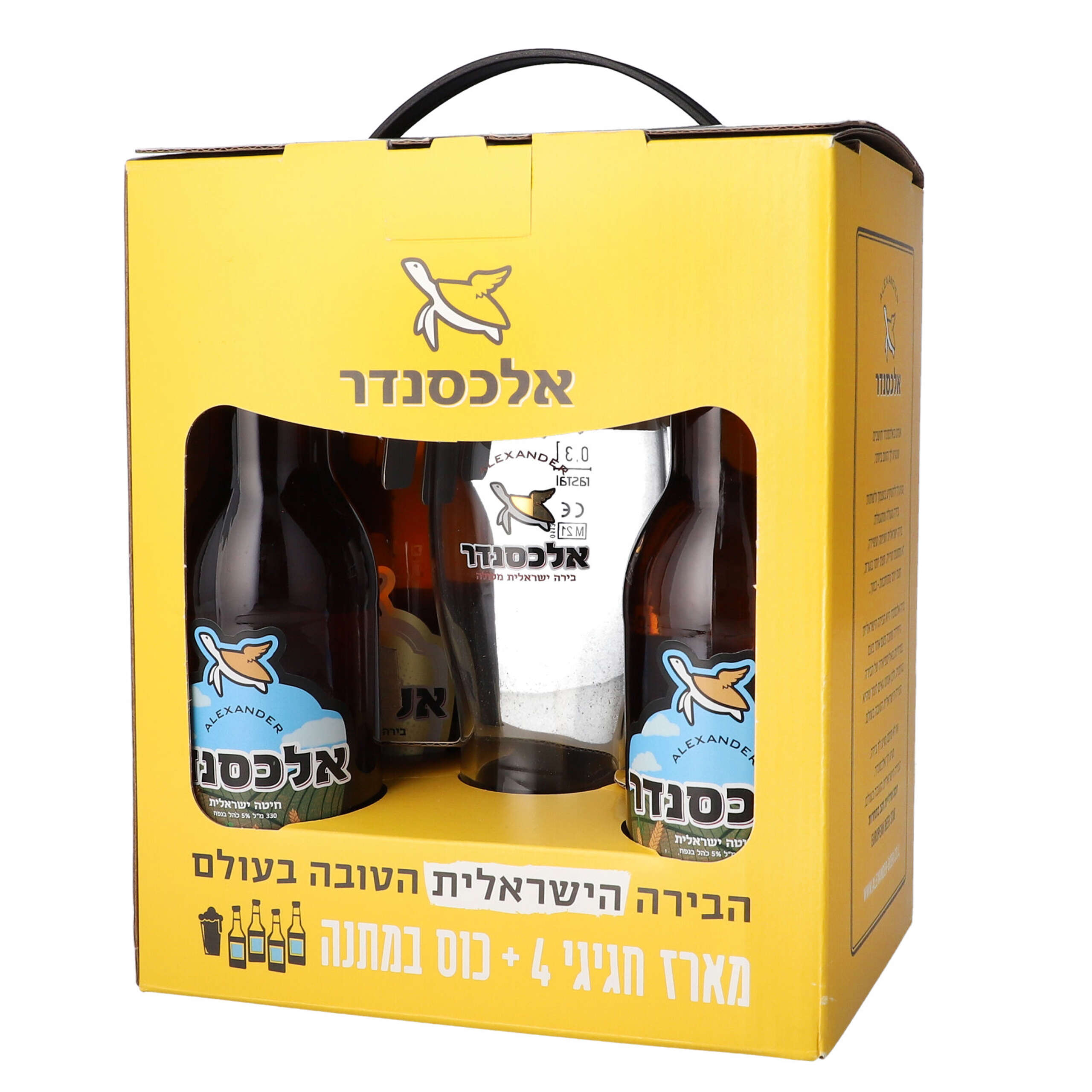 במארז יום העצמאות של בירה אלכסנדר מעוטרת הפרסים הבינלאומיים, תמצאו שני בקבוקי בירה Blonde (בירה בהירה עם ניחוח פירותי בסגנון אייל אנגלי, הבירה הנמכרת ביותר של המבשלת – 5.3% אלכוהול); זוג בקבוקי בירה "חיטה ישראלית" (בירה קלה עם חיטה משדות הנגב – 5% אלכוהול), וכוס זכוכית ממותגת.