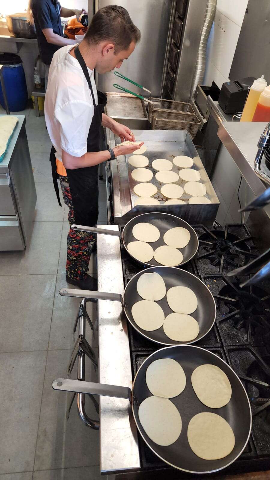 5) לחמם מחבת על אש בינונית-גבוהה, ולהניח עליה בעדינות את הטורטיות. מבשלים עד הצד הראשון עד שהפינות עולות קצת. הופכים את הטורטיות ומבשלים כ-30 שניות. הופכים בפעם האחרונה, מוציאים מהמחבת ומכנסים במגבת נקייה או משתמשים מיד.