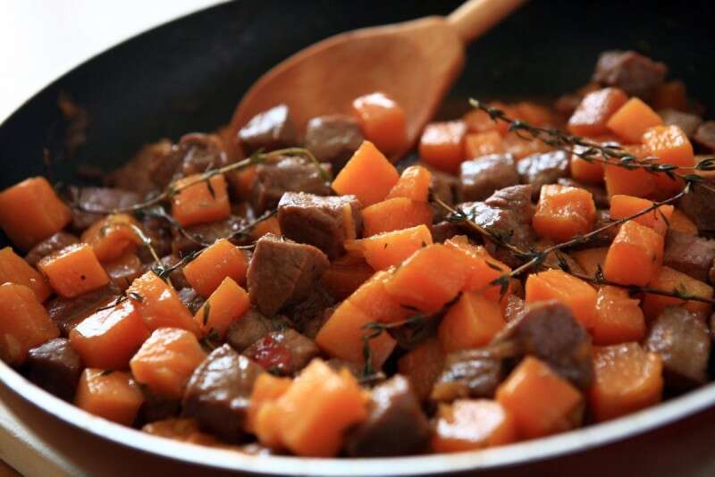 7. מאחדים את קוביות הדלעת, וקוביות הבקר, מתקנים תיבול ומגישים.