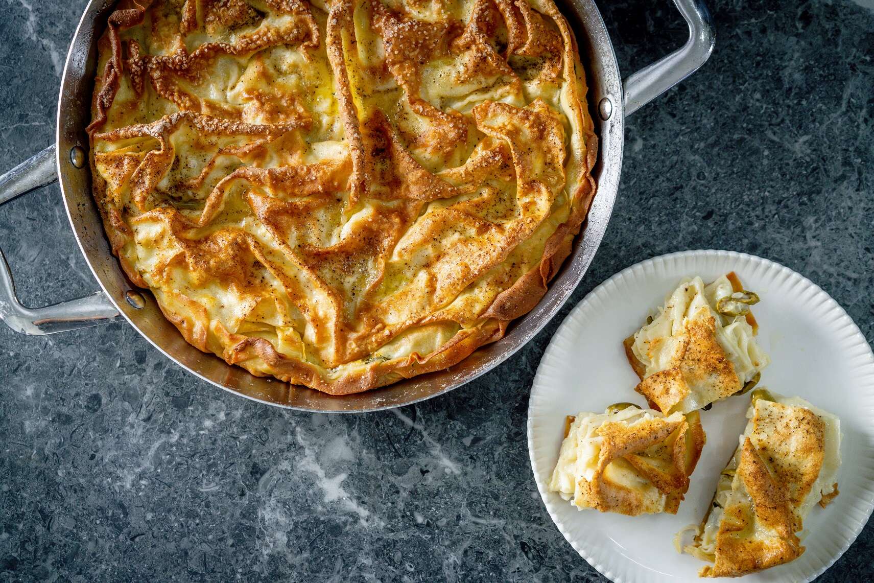 - אחרי הבישול מעבירים את דפי הבצק לתבנית ומברישים כל דף בחמאה מומסת. אחרי 3 שכבות מפזרים את המילוי, מניחים עליו עוד 3 שכבות של בצק מבושל ומברישים בחמאה מומסת.