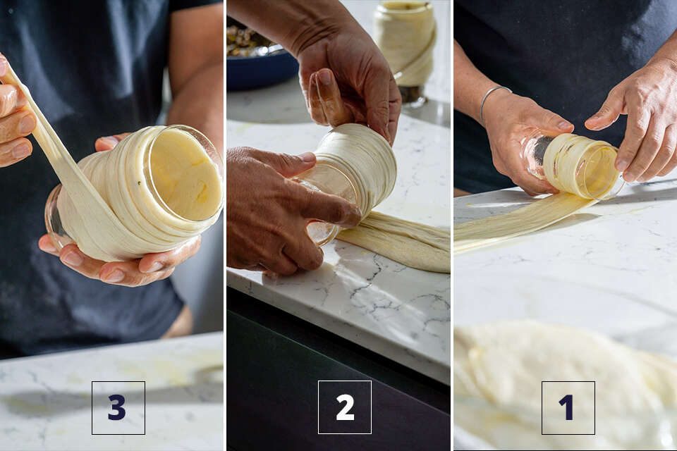 - תהליך גלגול הבצק (ראו תמונות מטה): מגלגלים כל רצועה מסביב לכוס צרה. חשוב למתוח את הבצק כמה שיותר כשמגלגלים.