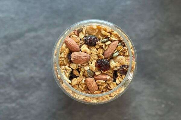 - לאחר ששיבולת השועל מוכנה והתקררה, מוסיפים לתבנית את האגוזים והגרעינים הקלויים, אגוזי המלך, החמוציות והשומשום ומערבבים היטב.