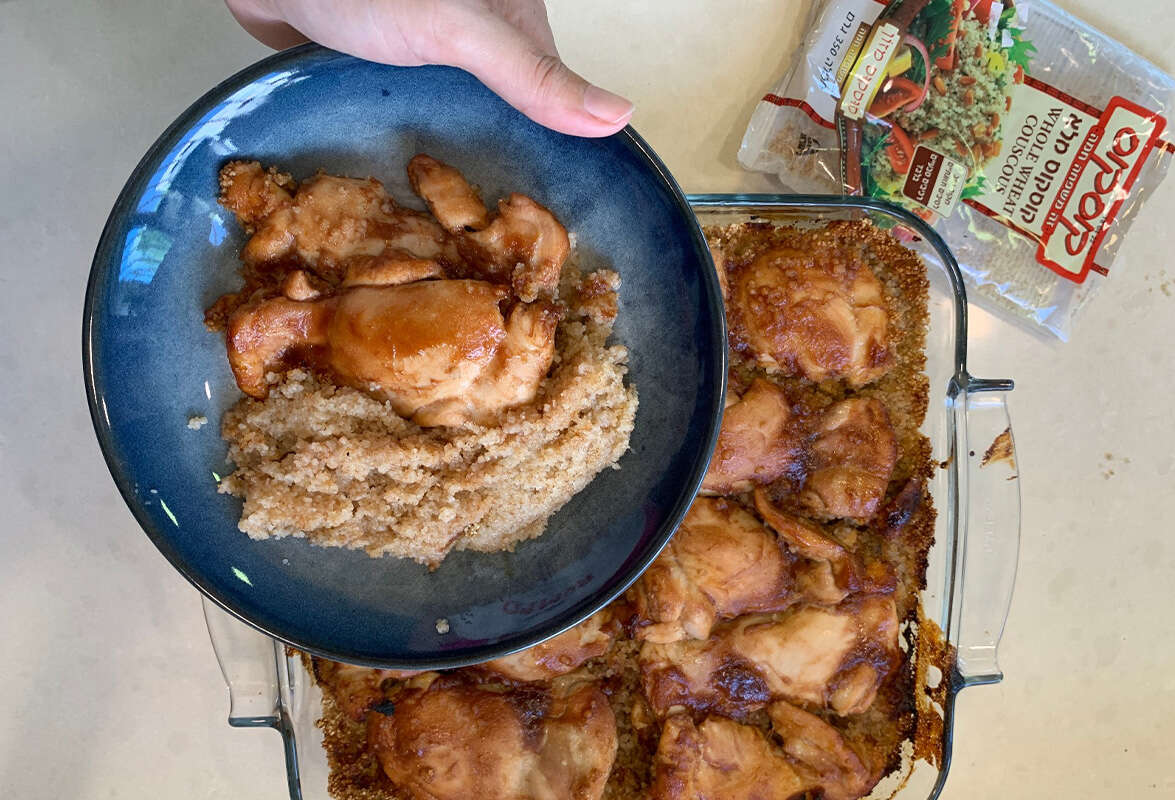 • מניחים את הפרגית על הקוסקוס ושופכים את שארית המרינדה על הקוסקוס.
