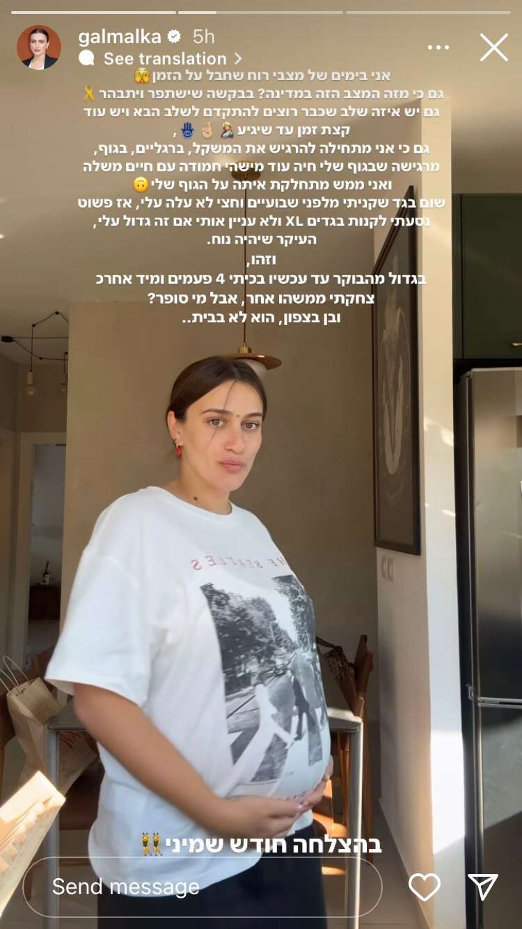 "אני בימים של מצברי רוח שחבל על הזמן", שיתפה מלכה על רקע סרטון קצר שלה. "גם כי מה זה המצב הזה במדינה? בבקשה שישתפר ויתבהר. גם יש איזה שלב שכבר רוצים להתקדם לשלב הבא ויש עוד קצת זמן עד שיגיע", התייחסה להריונה המתקדם. "גם כי מתחילה להרגיש את המשקל ברגליים, בגוף, מרגישה שבגוף שלי חיה עוד מישהי חמודה עם חיים משלה, ואני ממש חולקת איתה את הגוף שלי", שיתפה בתחושות.