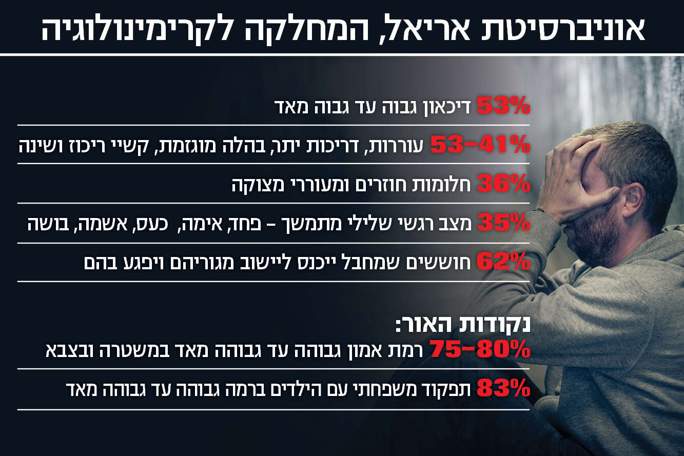 המחקר נערך על-ידי המחלקה לקרימינולוגיה וכלל מדגם מייצג של 844 איש. הוא בוצע כשבועיים וחצי-שלושה לאחר השבת השחורה. הממצאים, כאמור, מאששים את התחושות הקשות שרבים מאיתנו חווים מאז. מהנתונים עולה כי משתתפים רבים דיווחו על סימפטומים של דיכאון, בהם חוסר מוטיבציה והנאה ותחושות של דכדוך: 24% דיווחו על רמות דיכאון בינוניות ו-29% דיווחו על רמות דיכאון גבוהות עד גבוהות מאוד.