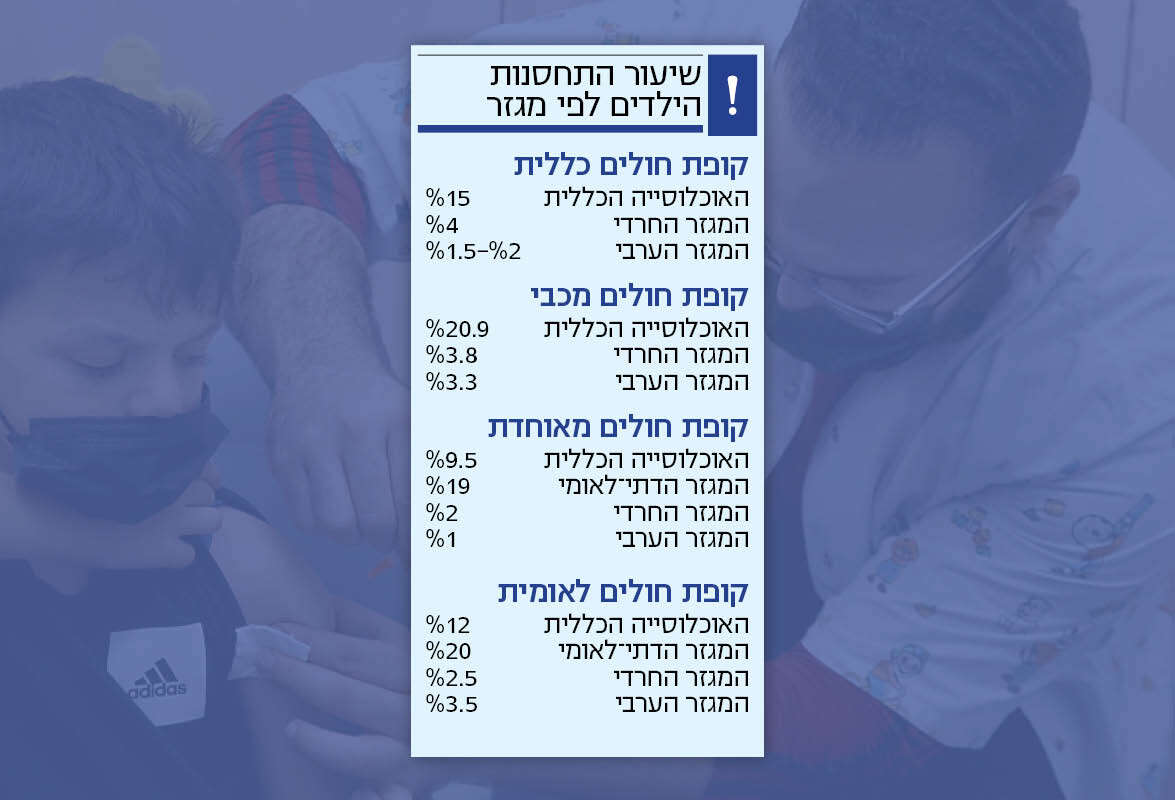 שיעור הילדים החרדים שהתחסנו נמוך פי שבעה מאשר באוכלוסייה היהודית החילונית, ושיעור הילדים שהתחסנו באוכלוסייה הערבית - נמוך פי 13. מהנתונים עולה כי רק 1.1% מבני 5 עד 11 במגזר הערבי התחסנו לקורונה ואילו במגזר החרדי התחסנו רק 1.9%, כאשר במגזר הכללי התחסנו 14% מהילדים. לפי משרד הבריאות עד כה התחסנו 110,700 ילדים בגילים אלה: במגזר הכללי - 103,039, במגזר החרדי 3,901 ובמגזר הערבי 3,105. בסך הכל בקבוצת הגיל 5 עד 11 ישנם 1.242 מיליון ילדים, ו־18% מהם (224 אלף) נחשבים מחלימים.