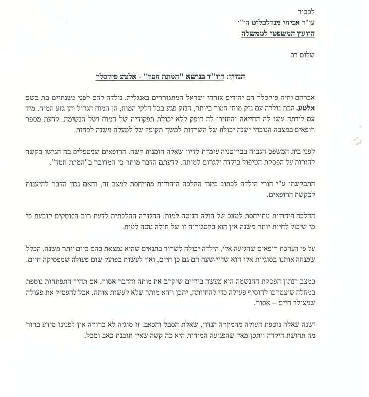 בית המשפט העליון לענייני משפחה בבריטניה דחה לאחרונה את בקשת המשפחה להעביר את הפעוטה, אלטע פיקסלר, שאינה מתקשרת עם סביבתה ולא נושמת בכוחות עצמה בעקבות סיבוך בלידה.