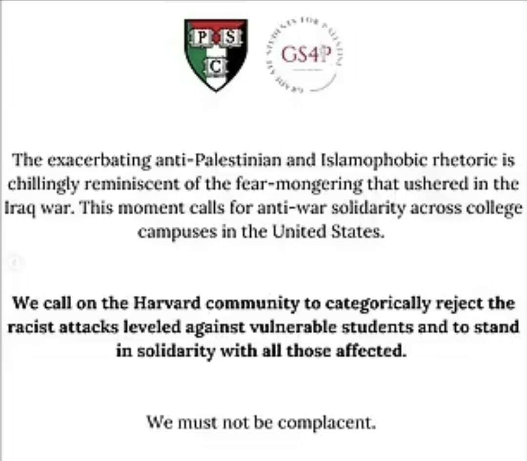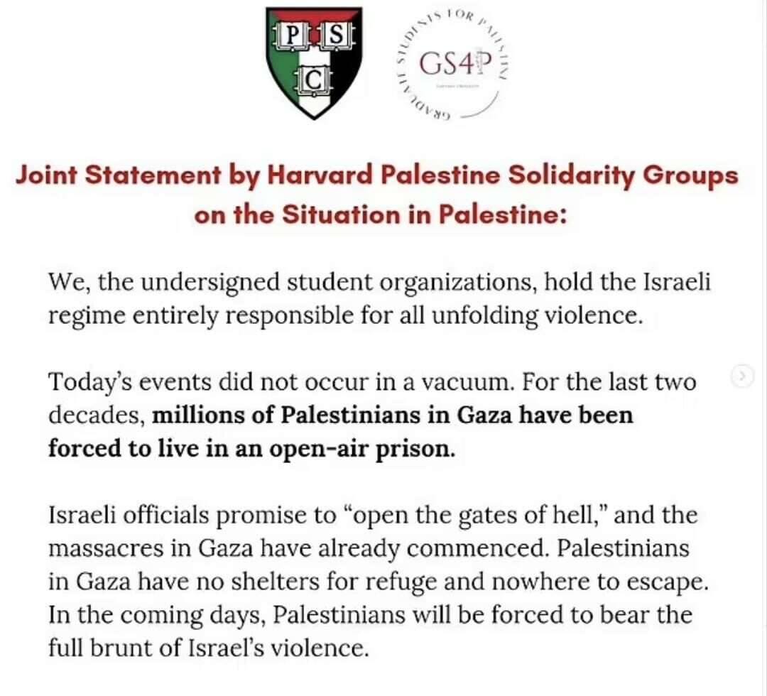 עוד נכתב בהצהרה: "יש להאשים רק את משטר האפרטהייד" וכי הוא האחראי להתקפת הטרור של חמאס, כששורת הארגונים קראה לקהילת הרווארד לפעול על מנת "לעצור את ההשמדה המתמשכת של הפלשתינים".