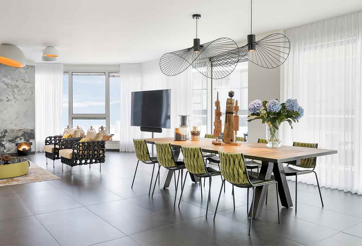 חשוב לייצר נקודת כוח (focal point). זו יכולה להיות מורכבת מהנוף, מהצמחייה שבמרפסת, מאמנות שתלויה בסלון, מקמין מעוצב ועוד, ומשם להמשיך ולתכנן את סידור פריטי הריהוט והתאורה, בהתאמה.