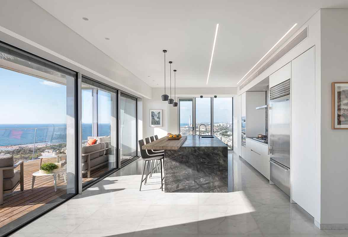 ריצוף טבעי שהגיע ישירות מהטבע, בין שמדובר באבן טבעית בעיבוד מגניב ובין שברצפת עץ אמיתית שכיף לדרוך עליה, לחוש אותה, להתבונן בה, או בטון יצוק שסופג אור בצורה מיטבית. אני ממליץ לשלב חימום תת־רצפתי, זאת תוספת ששווה את ההשקעה.