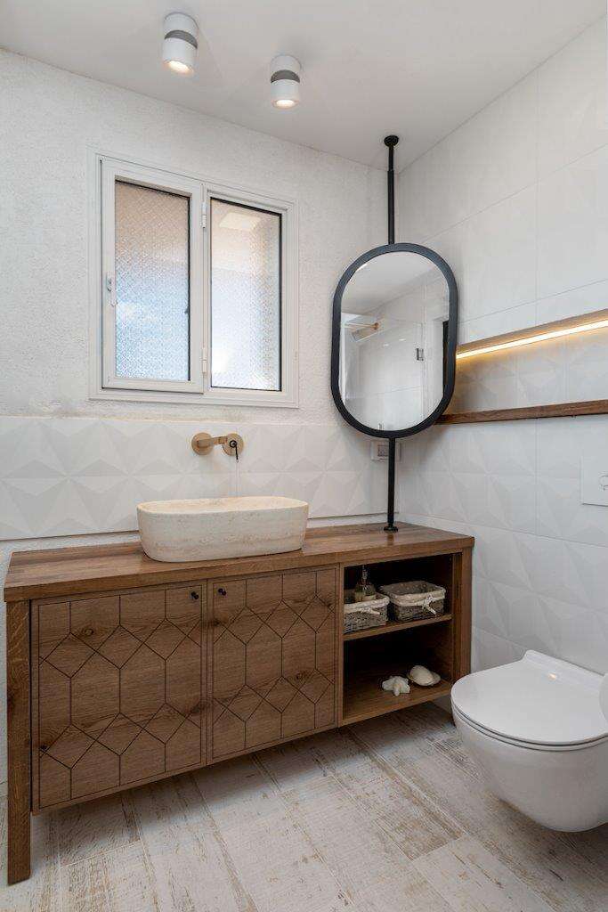 מראה אובלית בצידו הימני של ארון האמבט, מרככת את מראה הקווים הישרים, צילום: שירן כרמל