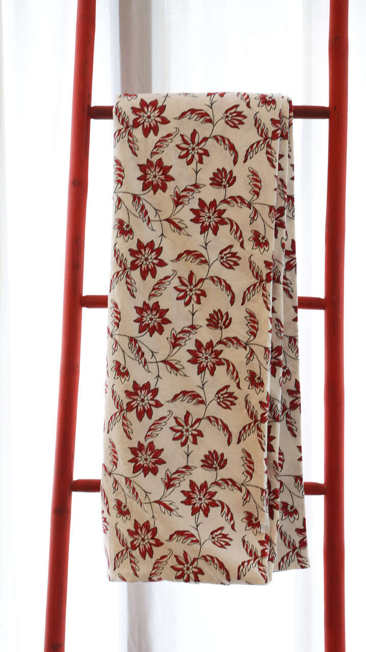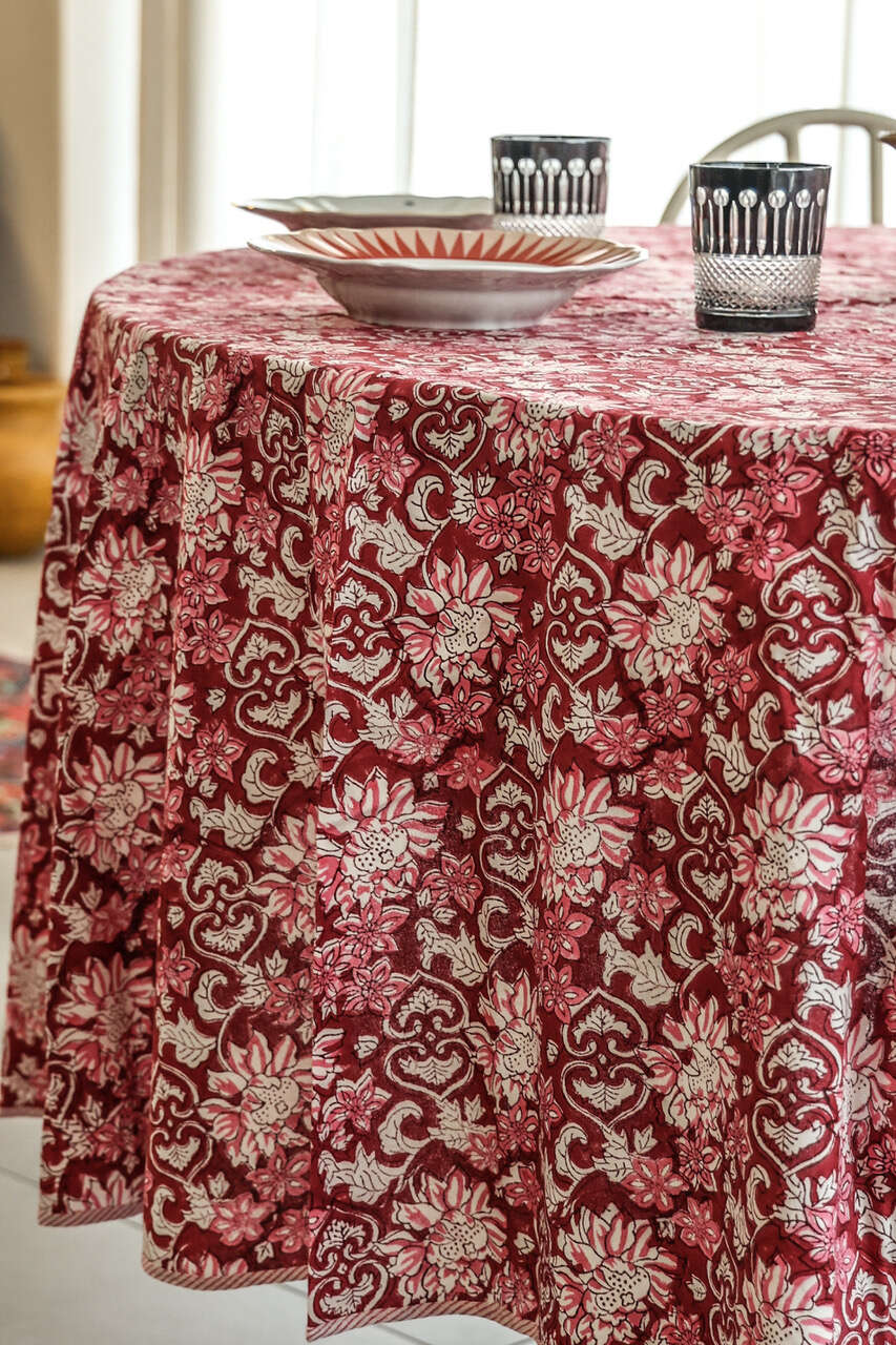 הדפסים בוטניים בגוון אדמדם על מפה של גלביה // צילום: מלכה ניהום