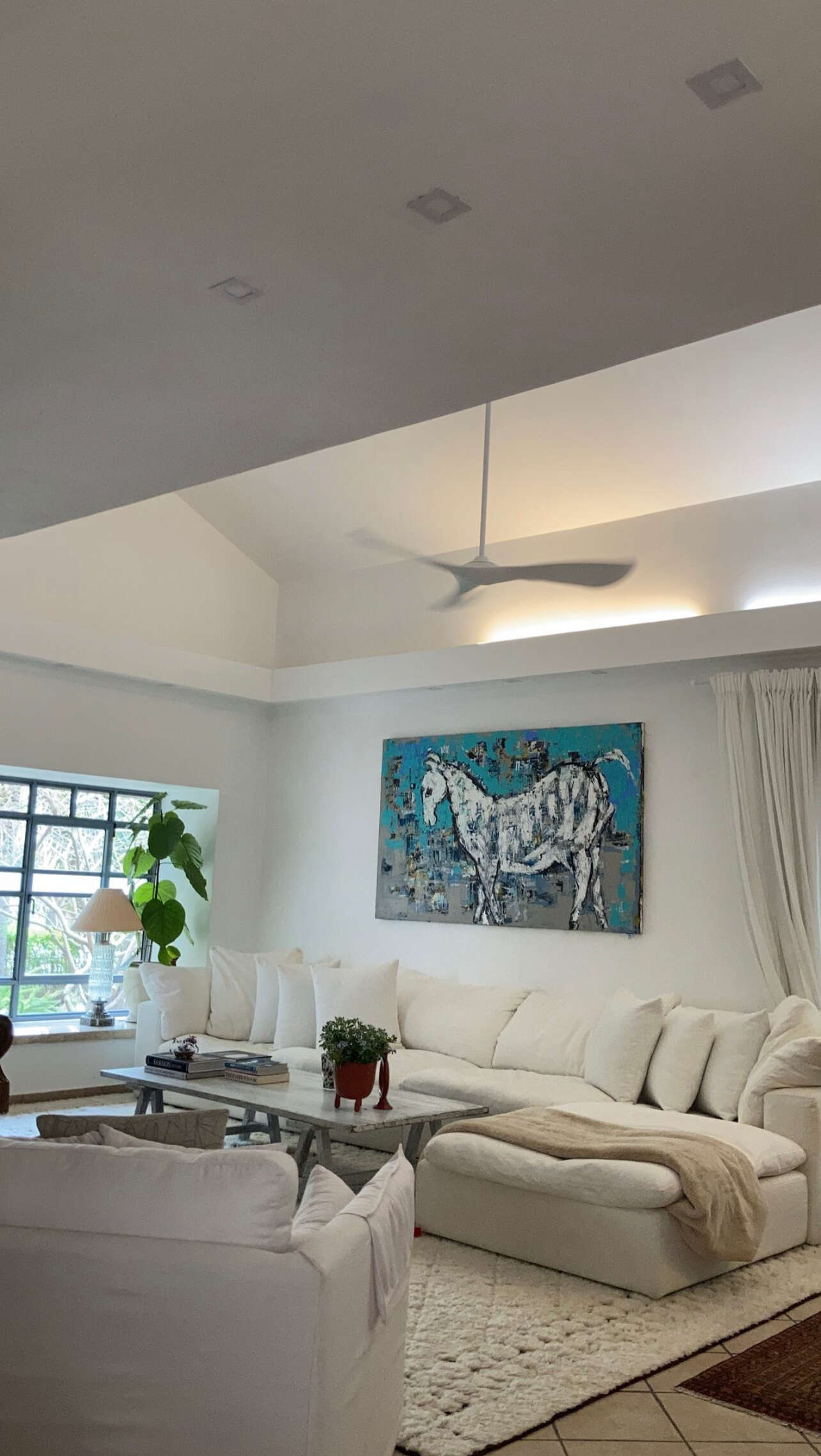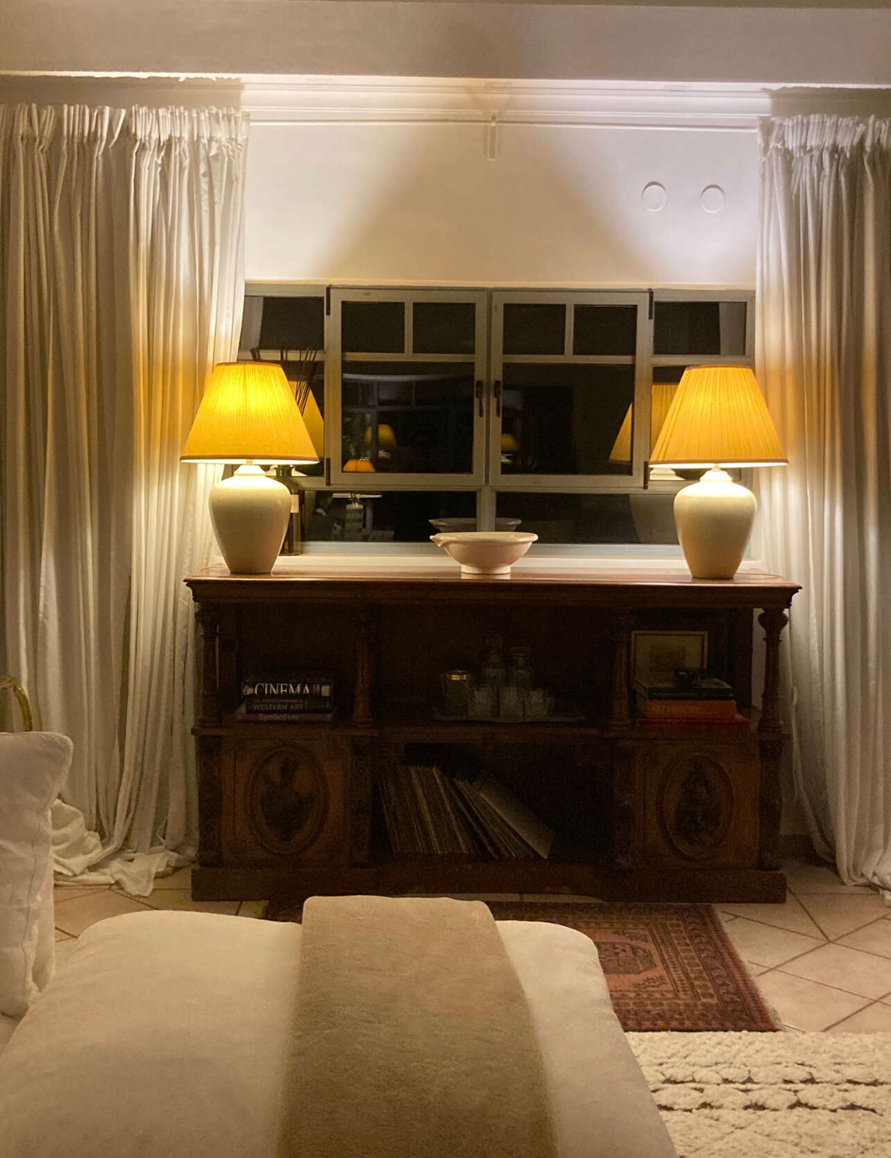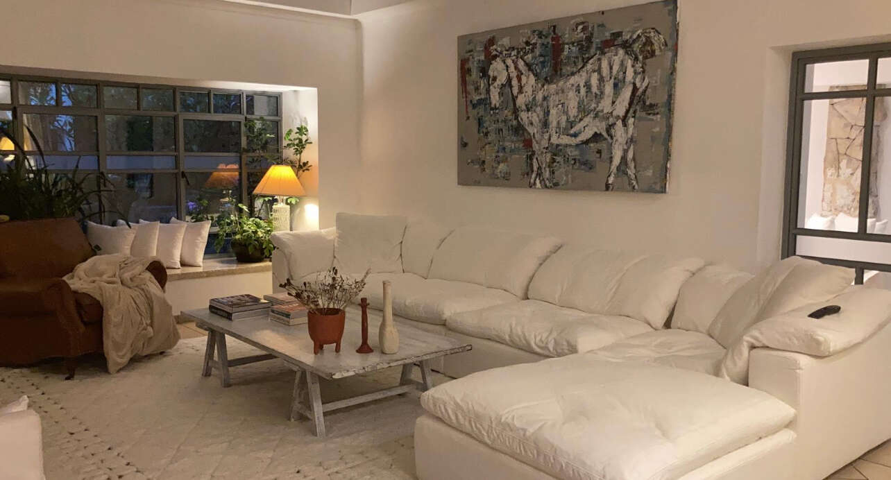 "אני אוהבת לבן, אבל זה לא יכול להיות לבן מדי. הסלון שלי לבן וסביבו יש כתמי צבע. עוד לפני שנחשפתי לעבודות של תמי, קנינו יצירה של הזמר דוד ד'אור. ראיתי עבודה שלו ב'פנטהאוז', וזה התאים בול לבית הזה. השטיחים האפגניים הכהים והקטיפות מזכירים לי את בית ילדותי והם משולבים גם בבית שלי. זהו חיבור אקלקטי של סגנונות. אני נוהגת להשתתף במכירות פומביות של עתיקות, לבחור פריטים בשוקי פשפשים, אלו פיסים שאתה מתאהב בהם. אני קונה גם אצל דבורה שיק, חנות לפריטים עתיקים בתל אביב. יש לי ממנה לא מעט פריטים. אני נורא אוהבת לשלב את העתיקות עם הקו המודרני".