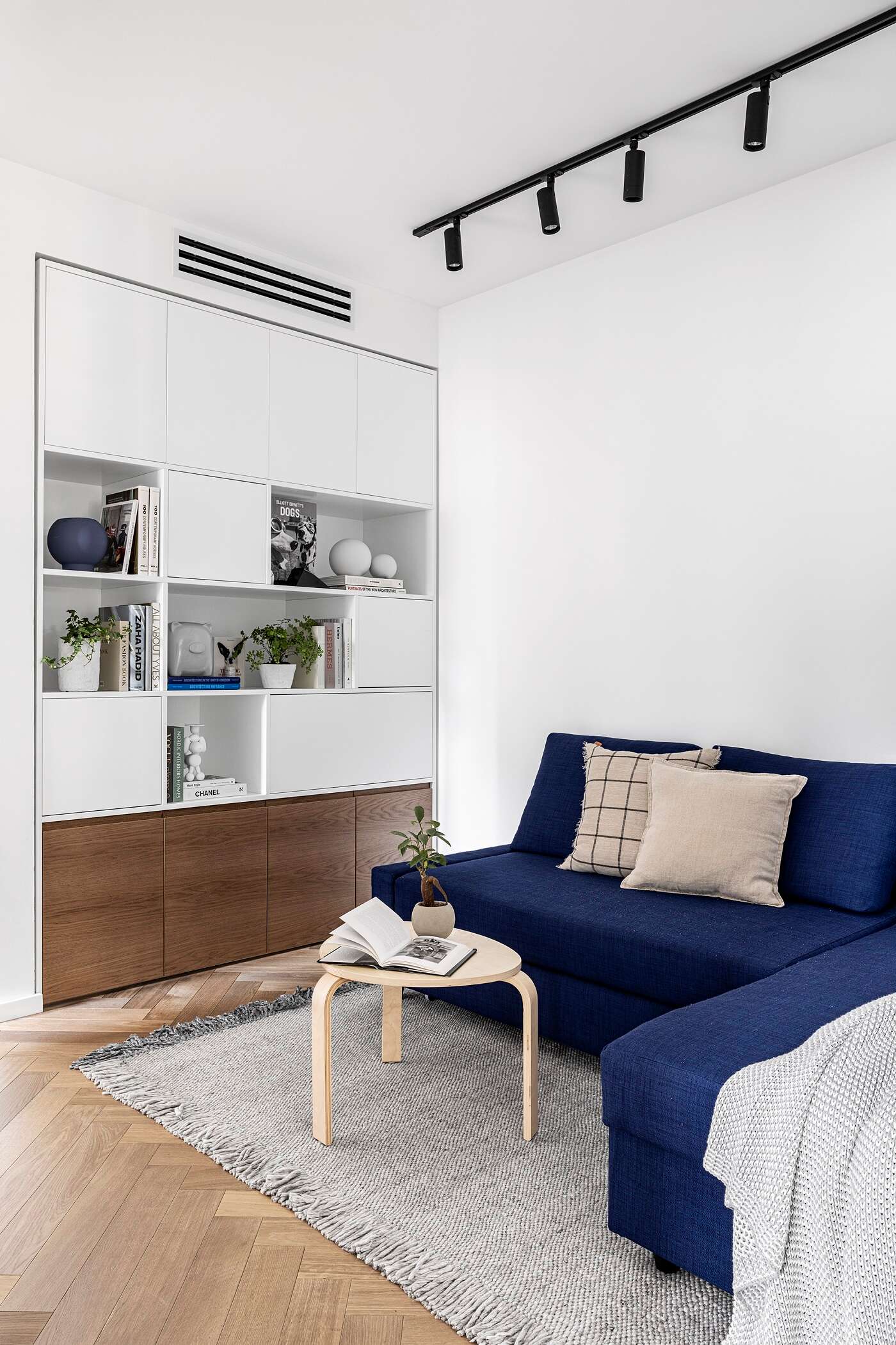 מרחב הסלון מינימליסטי ומורכב משתי ספות וכורסת עור. את המראה משלימים שטיח רחב ידיים ומערך וילונות בגוון בהיר, שמאפשר לאור לחדור ולשטוף את החלל באור רך. כורסת העור החומה מכניסה נגיעת צבע מדודה שמחממת את החלל ומדייקת את המראה.