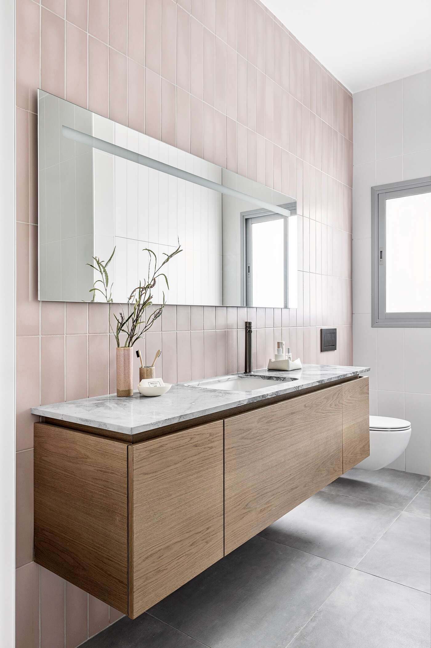 החדרים של הבנות של בני הזוג עוצבו בגווני ורוד נעימים וחמים, וגם עבורם תוכננו ארונות קיר בהתאמה אישית עם מקום לספרים ומשחקים. הבנות חולקות חדר רחצה שעבורו נבחרו אריחים ורודים לקירות ואריחים אפורים לרצפה. משטח השיש זהה למשטח העבודה במטבח. הוא מונח מעל יחידת נגרות שמחופה בפורניר, ומעליו מראה מרחפת בשילוב תאורה פנימית וברזים בגוון גרפיט.