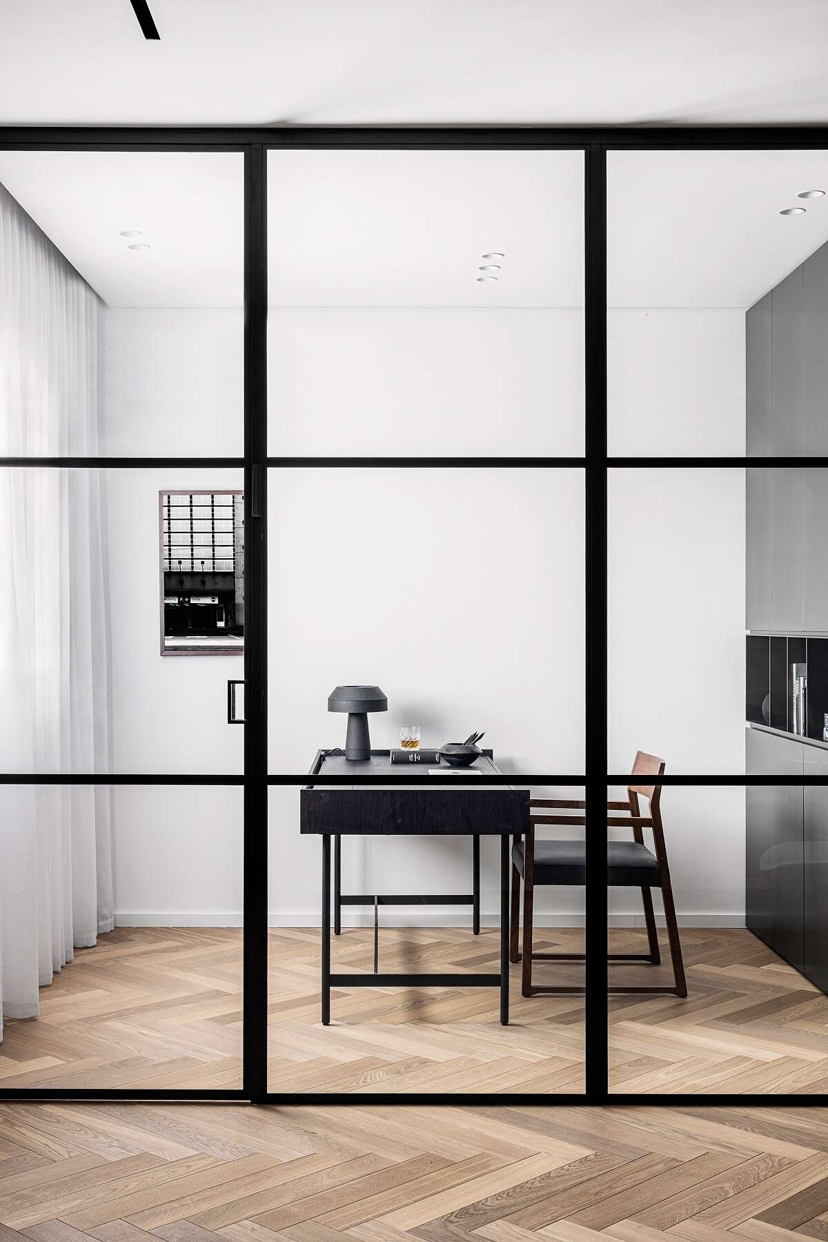 לצד פינת האוכל תוכננה מחיצת זכוכית המפרידה בין החלל הציבורי ובין המשרד הביתי, אך כזו שאינה מאפשרת לאב המשפחה, שעובד מהבית, לשמור על קשר עין עם בני הבית בזמן העבודה.