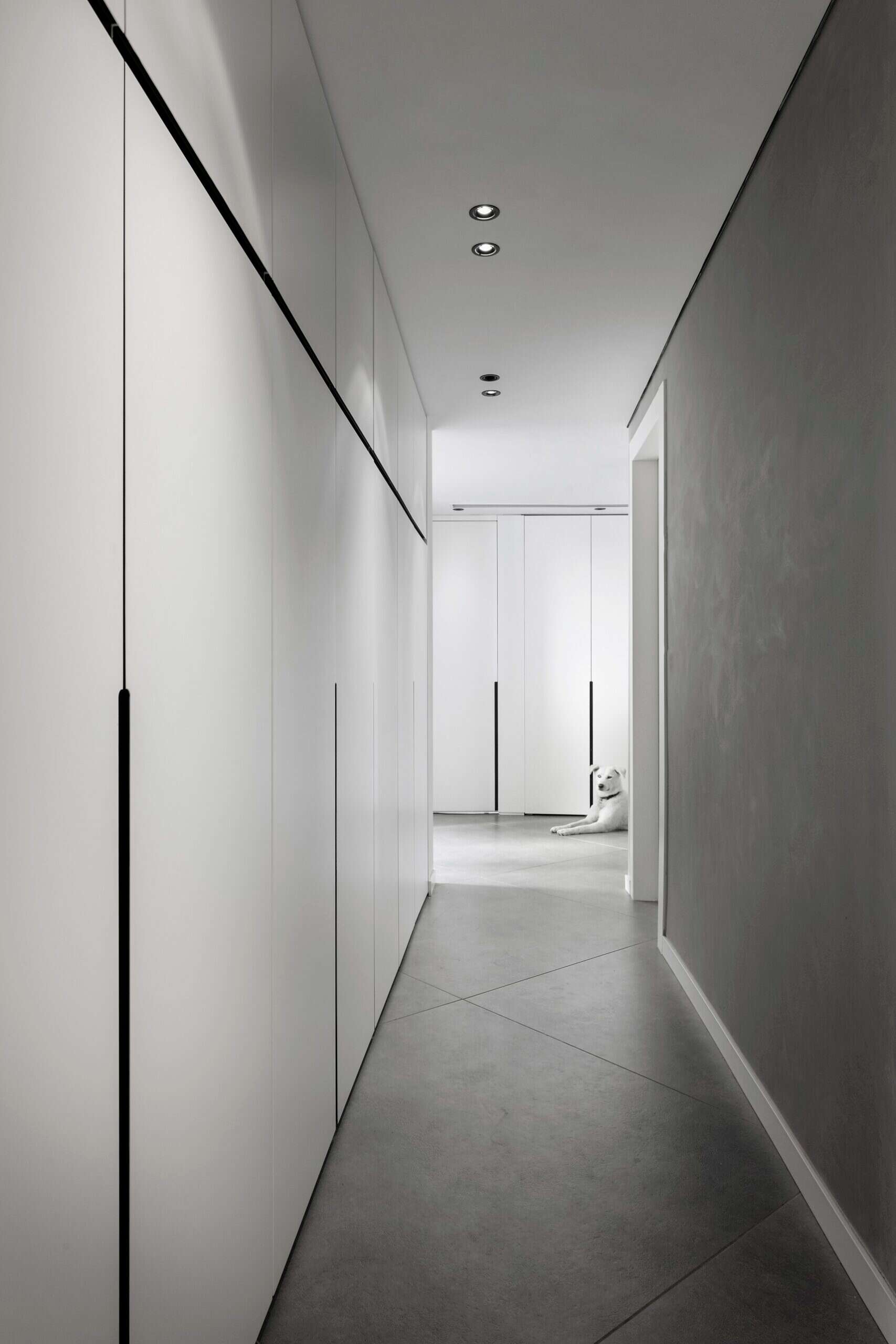 במסדרון שמוביל לאגף חדרי השינה, תכנן יוסף מערך ארונות במישור הקיר ובגוון שלו, ובכך יצר מראה שנטמע בקיר בצורה נקייה ואחידה. שדרת הארונות יוצרת שפע של אחסון – ממגבות וכלי מיטה ועד פריטים לשימוש יומיומי.