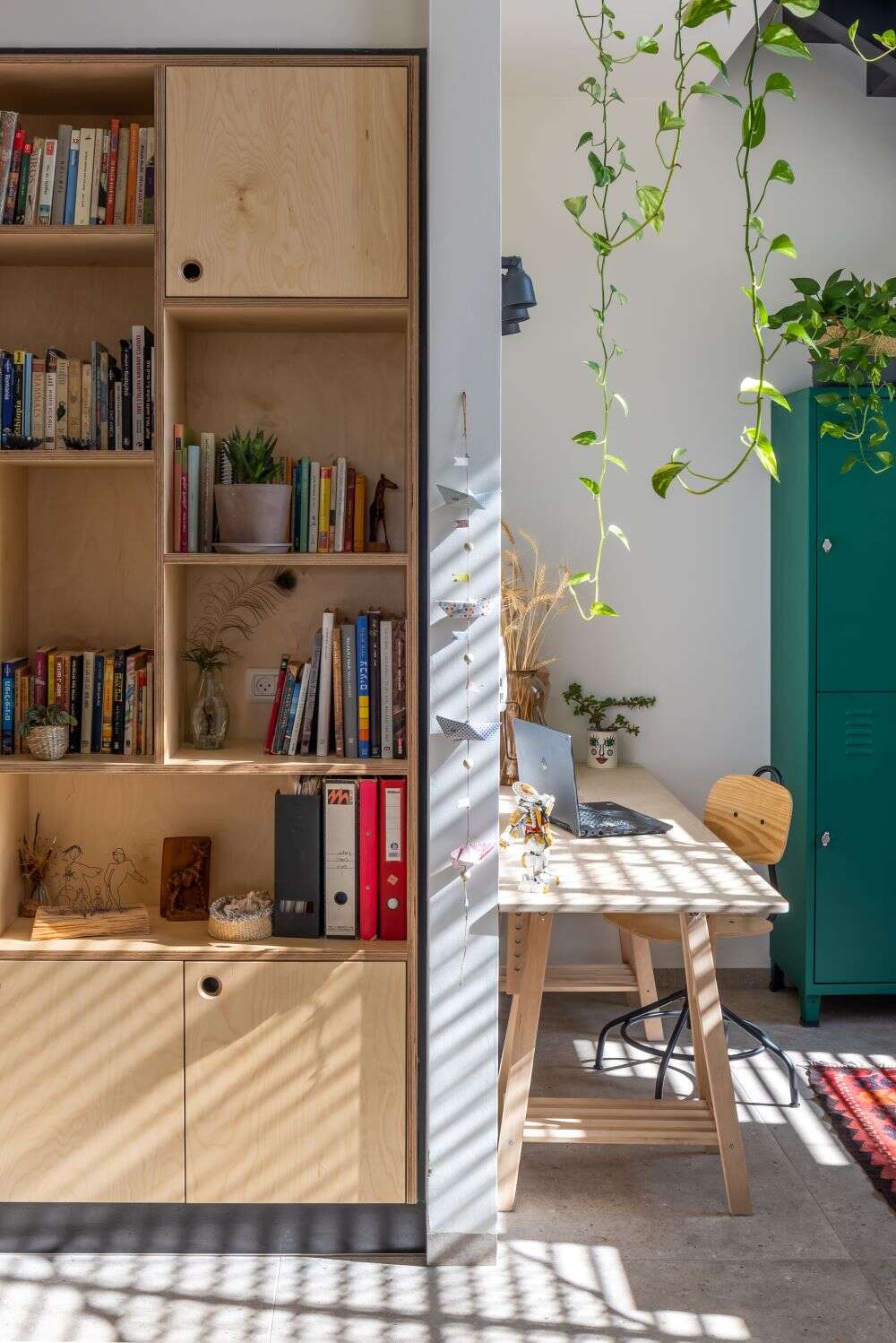 שולחן העבודה השני ממוקם בצידו השני של החלל וגובל עם ספריית העץ שמשרתת את הסלון. תכנון: ינון בן דוד // צילום: שי אפשטיין