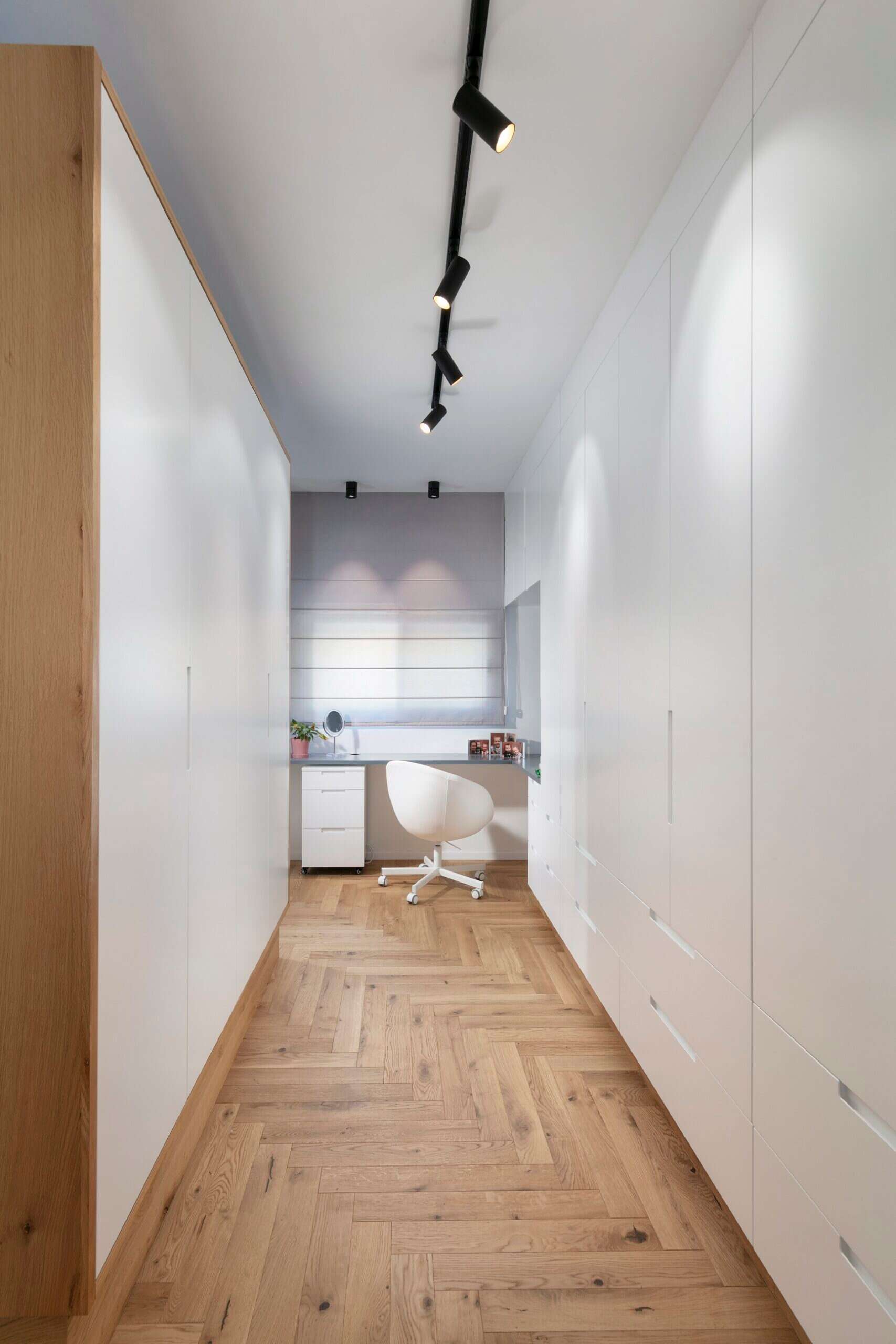 קווים לדמותה: פינת עבודה שממוקמת בקצה המסדרון, המורכבת משולחן במראה צף ותחתיו שידת מגירות על גלגלים שמאפשרת להזיזה בקלות במידת הצורך.