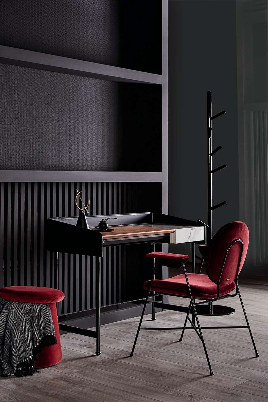 הכי אהבנו: כיסא הקטיפה בגוון בורגונדי מוסיף כתם צבע, ומציע בנוסף ריפוד נוח לישיבה ממושכת.