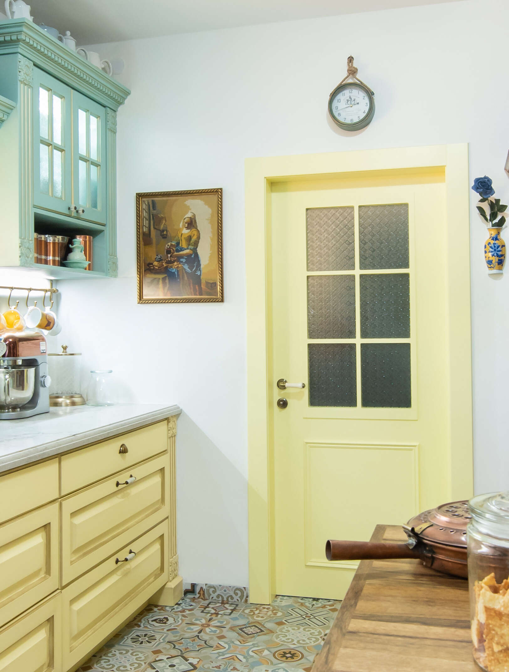 שילובים לא שגרתיים של גווני בננה, מנטה, כחולים, חמרה ופליז. שילובי צבעים נועזים נותנים את הטון בבית, ועם זאת הכל משתלב היטב ויוצר תנועה הרמונית. במטבח שולבו גווני בננה עם ירוק מנטה ודלת צהובה. האריחים הצבעוניים שנבחרו מכילים את כל הגוונים יחד.